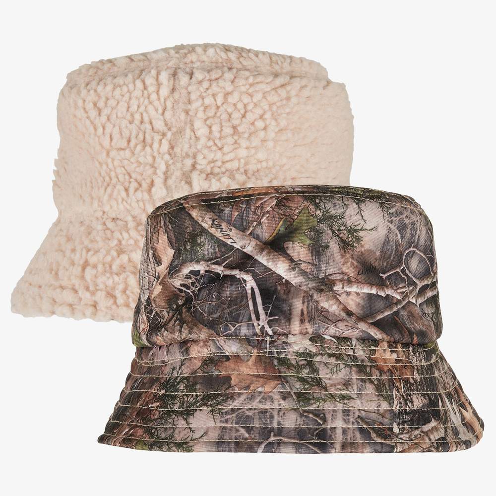 Ce bob en sherpa est une variante du bob classique. Réversible, il propose deux styles différents : un côté camouflage végétal avec des branches et des feuilles en camaieu de bruns, un côté en sherpa duveteux. Naturellement, il est doté d'un bord incliné classique orné de coutures décoratives.