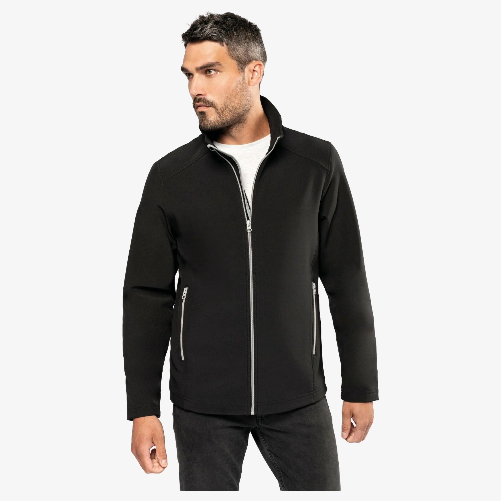 Softshelljacke 2 Lagen für Herren mit einem Äußeren aus 95% Polyester / 5% Elastan und einem Innenfutter aus 100% Polyester-Mikrofaser. Wasserdichtes Gewebe für effektiven Schutz vor den Wetterbedingungen. Enge Passform für optimalen Tragekomfort. Diese Jacke verfügt über 2 äußere Reißverschlusstaschen, um Ihre persönlichen Gegenstände zu verstauen und einen verlängerten Rücken für besseren Schutz. Verarbeitung mit Nähten an den Schultern und Seiten.