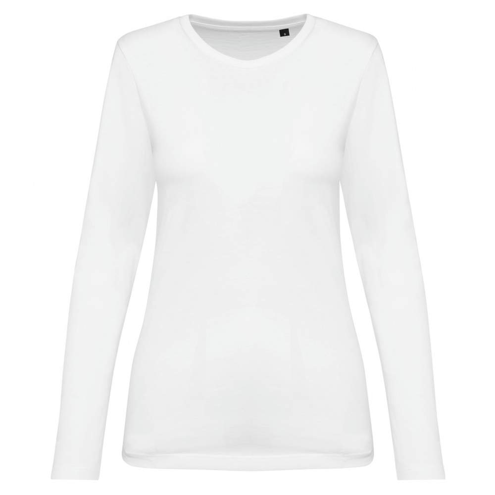 Damen-T-Shirt mit langen Ärmeln, aus Supima®-Kammgarn gefertigt. Dieser Jersey bietet eine große Feinheit und einen weichen, seidigen Griff. Der Schnitt mit Nähten sorgt für eine erhöhte Festigkeit. Der runder Halsausschnitt ist mit einem sauberen Bund in gleicher Farbe versehen. Eine verstärkte Naht an der Schulter mit Silikonband trägt zur Haltbarkeit des Kleidungsstücks bei. Der Ärmelsaum und der Saum des Kleidungsstücks sind mit einem doppelten Überwendlingsstich versehen. Dieses Modell hat kein Markenetikett am Kragen, aber einen unauffälligen Chip.