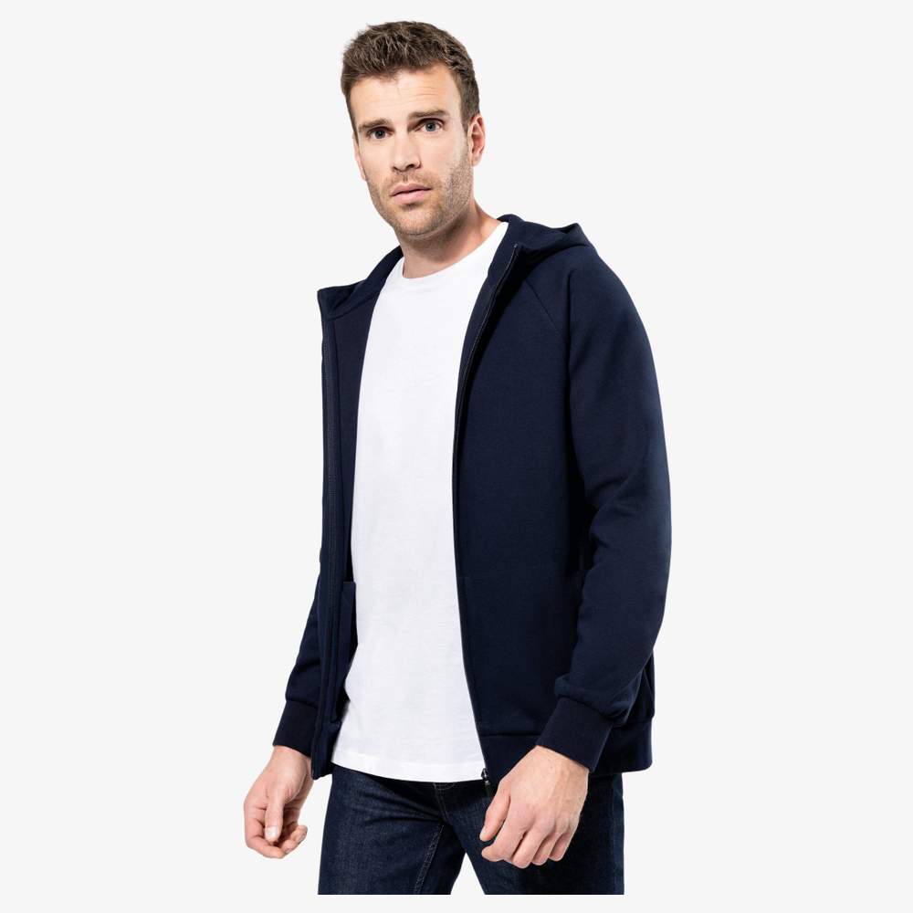 Männer Hoodie mit Reißverschluss. Aus Baumwolle Interlock gefertigt, bietet dieses Modell optimalen Komfort. Das Hoodie zeigt eine durchdachte Konstruktion mit besonderer Aufmerksamkeit auf die Details. Es ist mit einer gefütterten Kapuze und einem farblich abgestimmten Reißverschluss mit sauberer Verarbeitung ausgestattet. Die Raglanärmel und die Taschen, die in die Naht des Vorderteils eingearbeitet sind, fügen eine funktionale Note hinzu. Das Fehlen eines sichtbaren Markenetiketts wird durch einen unauffälligen Chip kompensiert.