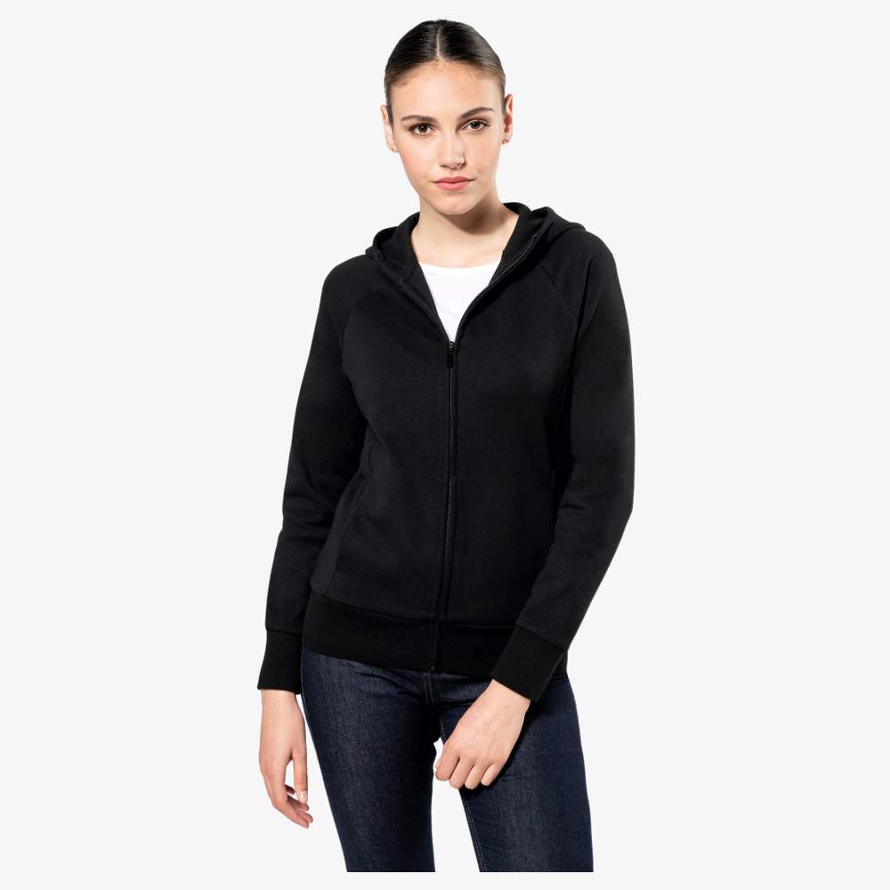 Gepolsterte Kapuzenjacke für Frauen. Gefertigt aus gekämmter Baumwolle mit einer LSI-Behandlung. Sie verfügt über eine 2-teilige Kapuze, die mit demselben Stoff wie der Rest der Jacke gefüttert ist. Säume am Kragen und ein Saumband an der Innenkante des Halsausschnitts. Nylon-Reißverschluss in der gleichen Farbe mit Metallreißverschluss und Saumband auf der Innenseite. Raglanärmel und Rippenstrick an den Handgelenken. Sie hat 2 Taschen, die in den Saum des Einsatzes genommen sind. Kein sichtbares Markenetikett, nur ein Größenchip.