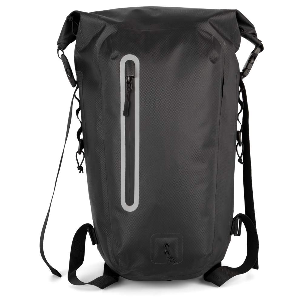 Rucksack für den Transport von Ausrüstung. Er bietet Schutz vor Feuchtigkeit durch seine Materialien und Konstruktion. Der Hauptfach ist über ein Rolltop-Verschlusssystem zugänglich, das eine erhöhte Dichtigkeit gewährleistet. Eine vordere Reißverschluss-Tasche ermöglicht den schnellen Zugriff auf kleine Gegenstände. Die Schulterriemen sind für optimalen Komfort auch bei längerem Tragen konzipiert. Ein Entlüftungsventil ermöglicht die Entfernung von Luft und Wasser aus dem Hauptfach. Eine Sicherheitspfeife, die in das Brustgurtband integriert ist, bietet zusätzliche Sicherheit.