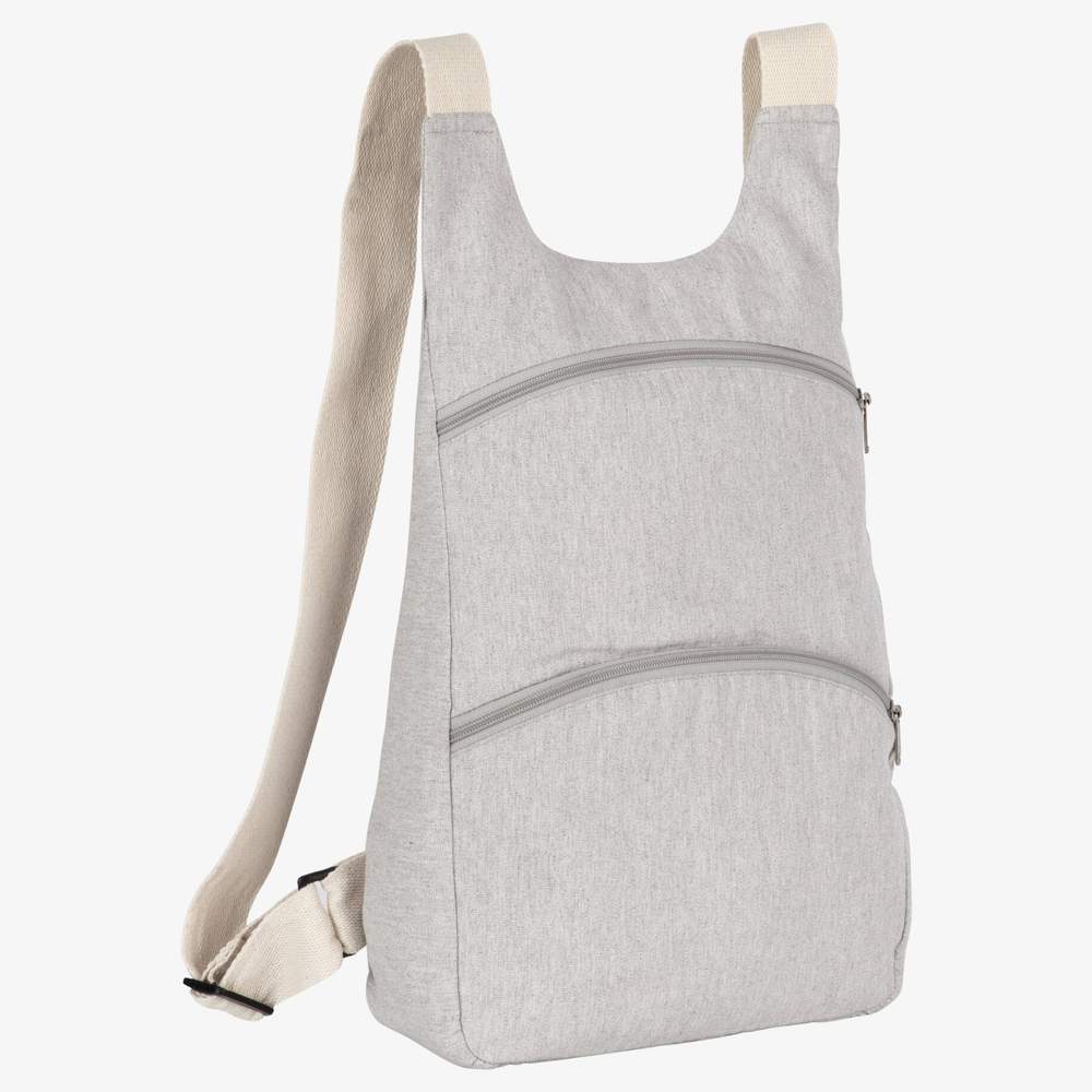 Rucksack aus recyceltem Baumwolle und recyceltem Polyester. Dieser Rucksack bietet ein großes Hauptfach, eine vordere Reißverschlusstasche und eine diskrete hintere Diebstahlschutz-Tasche für erhöhte Sicherheit. Die 4 cm breiten Träger sind für mehr Komfort beim Tragen konzipiert. Fassungsvermögen von 11 Litern und Maße von 28 x 10 x 40 cm.