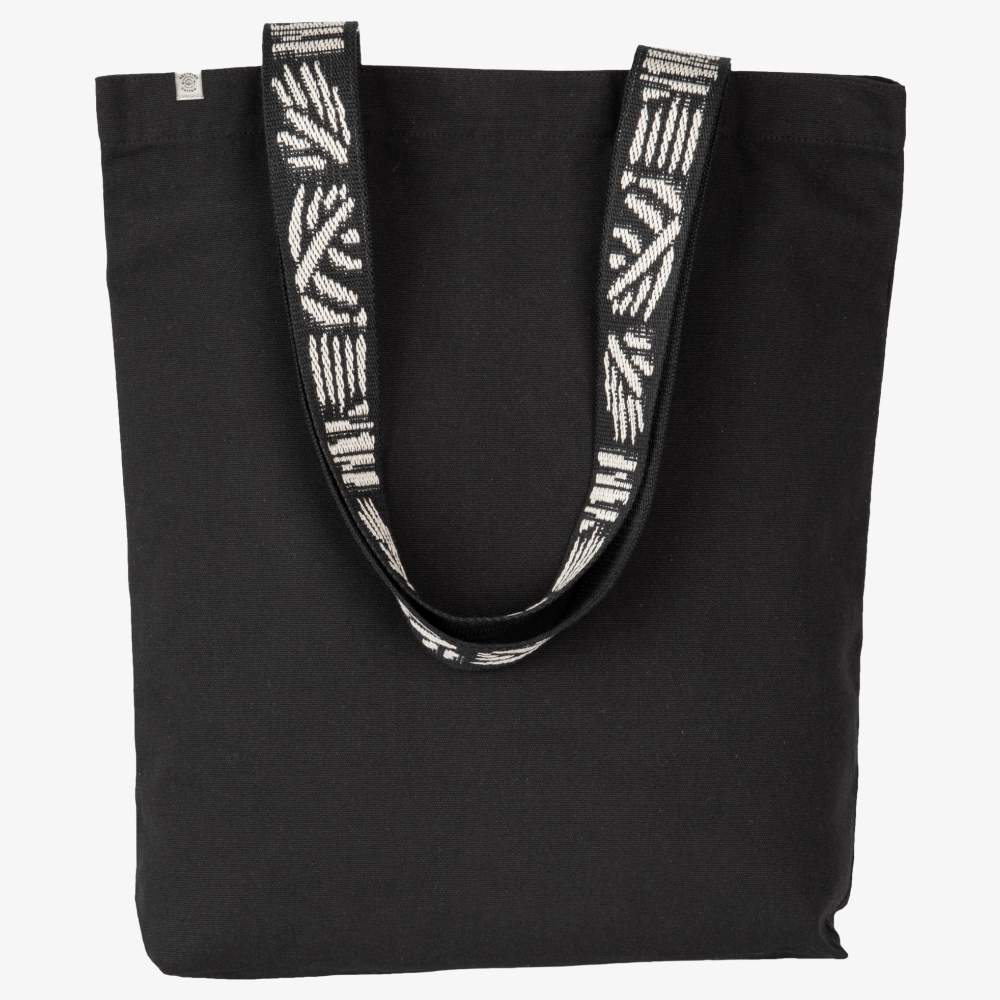 Recycelte Einkaufstasche für den täglichen Gebrauch. Sie bietet ein Fassungsvermögen von 12 Litern, sodass verschiedene Artikel transportiert werden können. Die Abmessungen betragen 38 cm Höhe und 42 cm Breite. Die kontrastierenden Henkel sind 60 cm lang und 4,25 cm breit, was das Tragen über der Schulter oder in der Hand erleichtert. Die Zusammensetzung der Tasche variiert je nach Farbe: Black Night besteht aus 67% recycelter Baumwolle, 30% recycelten Polyester und 3% anderen Fasern. Pebble Grey besteht aus 75% recycelter Baumwolle, 22% recycelten Polyester und 3% anderen Fasern.