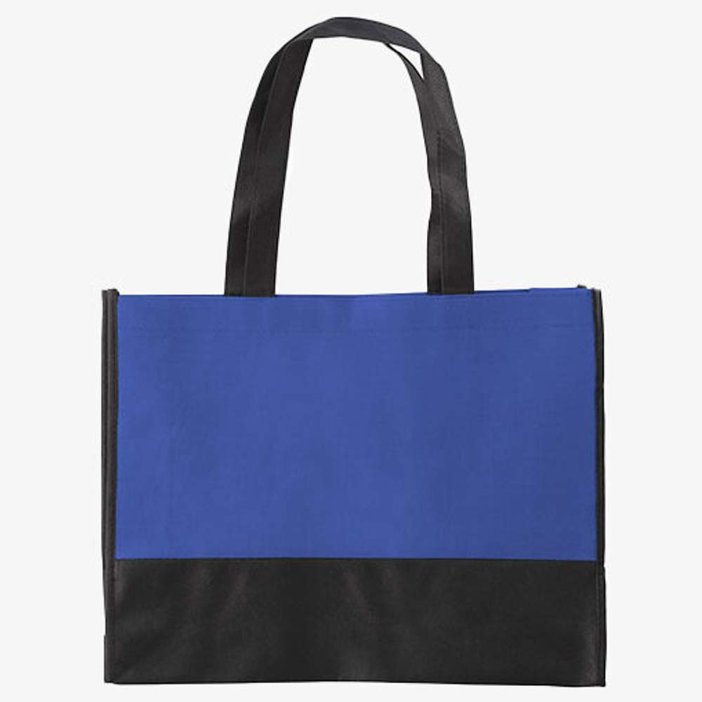 Einkaufsbeutel Nonwoven mit Griffen von 2,5 x 50 cm und seitlichem Klappverschluss. Ein Teil des unteren vorderen und hinteren Bereichs ist 8,5 cm hoch schwarz. Dieser Beutel bietet praktischen Stauraum für verschiedene Verwendungen. Seine Abmessungen sind 38 x 29 x 10 cm. Er ist aus 100% Polypropylen für eine gewisse Haltbarkeit und Widerstandsfähigkeit hergestellt.