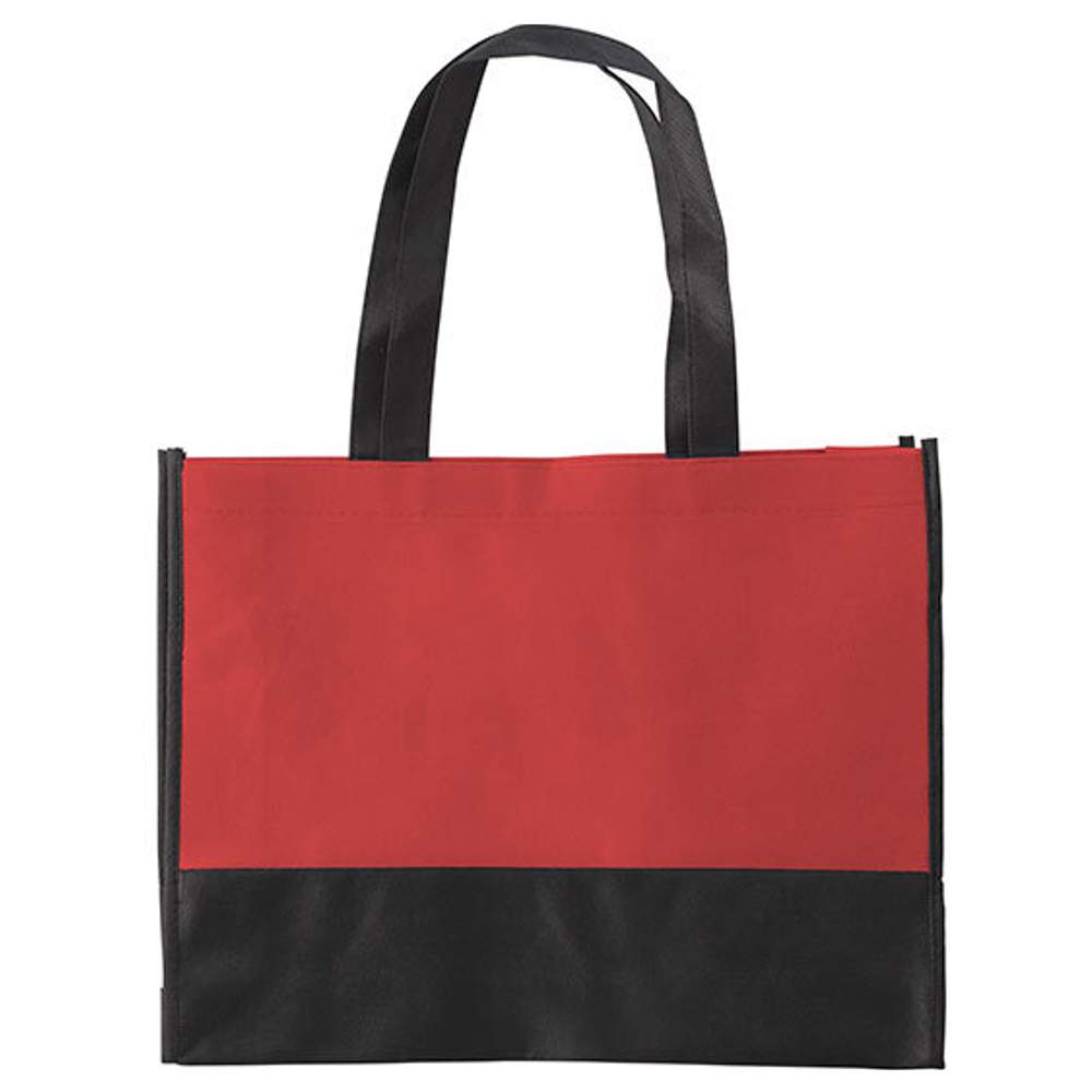 Einkaufsbeutel Nonwoven mit Griffen von 2,5 x 50 cm und seitlichem Klappverschluss. Ein Teil des unteren vorderen und hinteren Bereichs ist 8,5 cm hoch schwarz. Dieser Beutel bietet praktischen Stauraum für verschiedene Verwendungen. Seine Abmessungen sind 38 x 29 x 10 cm. Er ist aus 100% Polypropylen für eine gewisse Haltbarkeit und Widerstandsfähigkeit hergestellt.