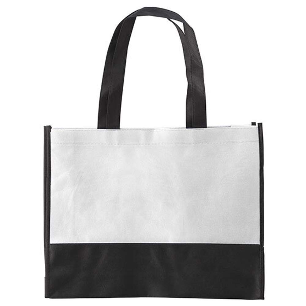 Einkaufsbeutel Nonwoven mit Griffen von 2,5 x 50 cm und seitlichem Klappverschluss. Ein Teil des unteren vorderen und hinteren Bereichs ist 8,5 cm hoch schwarz. Dieser Beutel bietet praktischen Stauraum für verschiedene Verwendungen. Seine Abmessungen sind 38 x 29 x 10 cm. Er ist aus 100% Polypropylen für eine gewisse Haltbarkeit und Widerstandsfähigkeit hergestellt.
