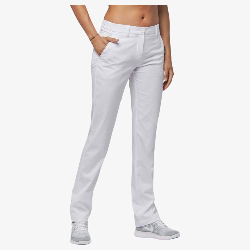 Diese Damenhose bietet optimalen Komfort durch ihr weiches und wasserabweisendes Material. Ihr eleganter und anliegender Schnitt passt sich jeder Figur an. Sie ist mit einem Gürtel mit Schlaufen für optimalen Halt sowie zwei tiefen Seitentaschen und zwei hinteren Reißverschlusstaschen mit Klappe für praktische Aufbewahrung ausgestattet.