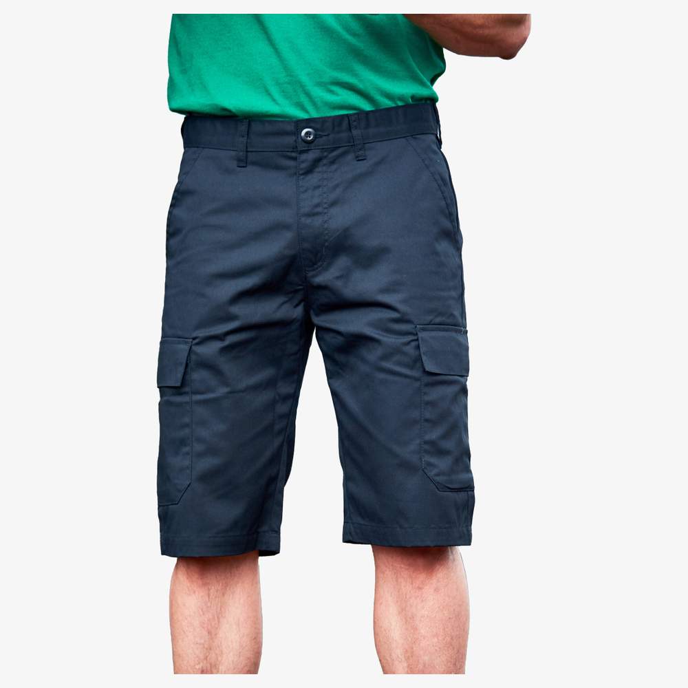 Arbeitsbermuda, entworfen für den professionellen Gebrauch. Es hat einen klassischen Gürtel mit fünf Schlaufen für eine sichere Befestigung. Der Reißverschluss ist praktisch zu schließen. Es verfügt über zwei seitliche vordere Taschen zum Aufbewahren kleiner notwendiger Gegenstände. Zwei seitliche Cargo-Taschen mit Klappen bieten zusätzlichen Stauraum für Werkzeuge oder andere notwendige Gegenstände. Eine aufgenähte hintere Tasche auf der linken Seite ermöglicht den einfachen Zugang zu häufig verwendeten Elementen. Die Gewebezusammensetzung ist 65% Polyester und 35% Baumwolle.
