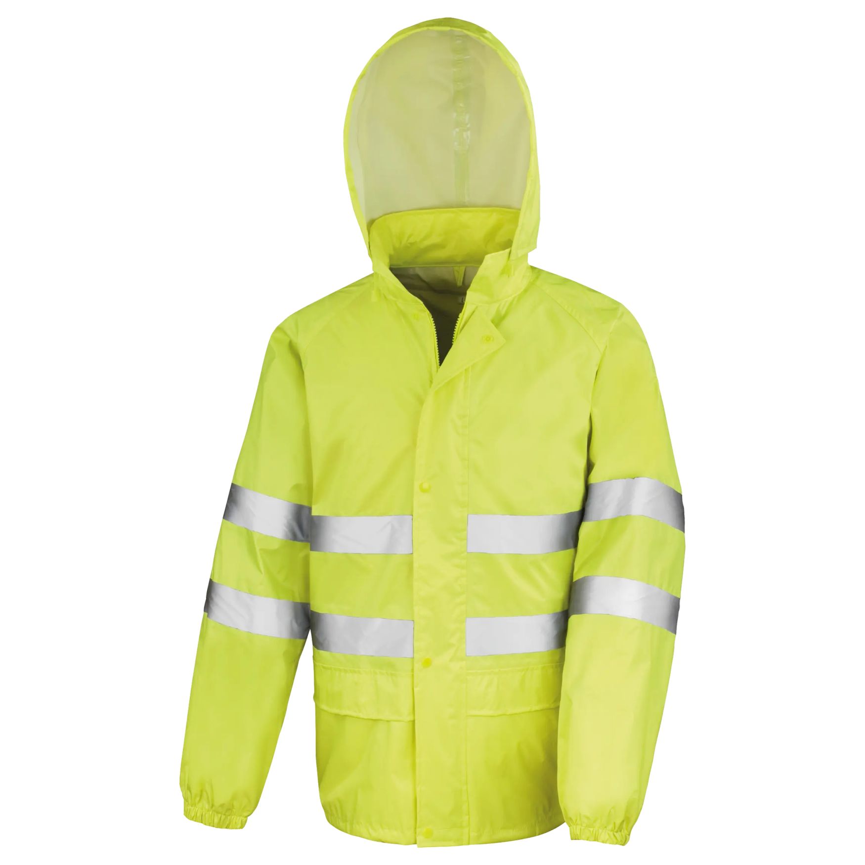 Hi vis Waterproof suit wasserdichter Overall 2000 mm mit thermoversiegelten Nähten und reflektierenden Streifen. Kapuze mit Kordelzug verstellbar, Belüftung am Rücken aus Mesh, Fronttaschen mit Patte und seitlicher Zugang. Elastischer Bund und elastische Bündchen, Saum mit Kordelzug verstellbar.