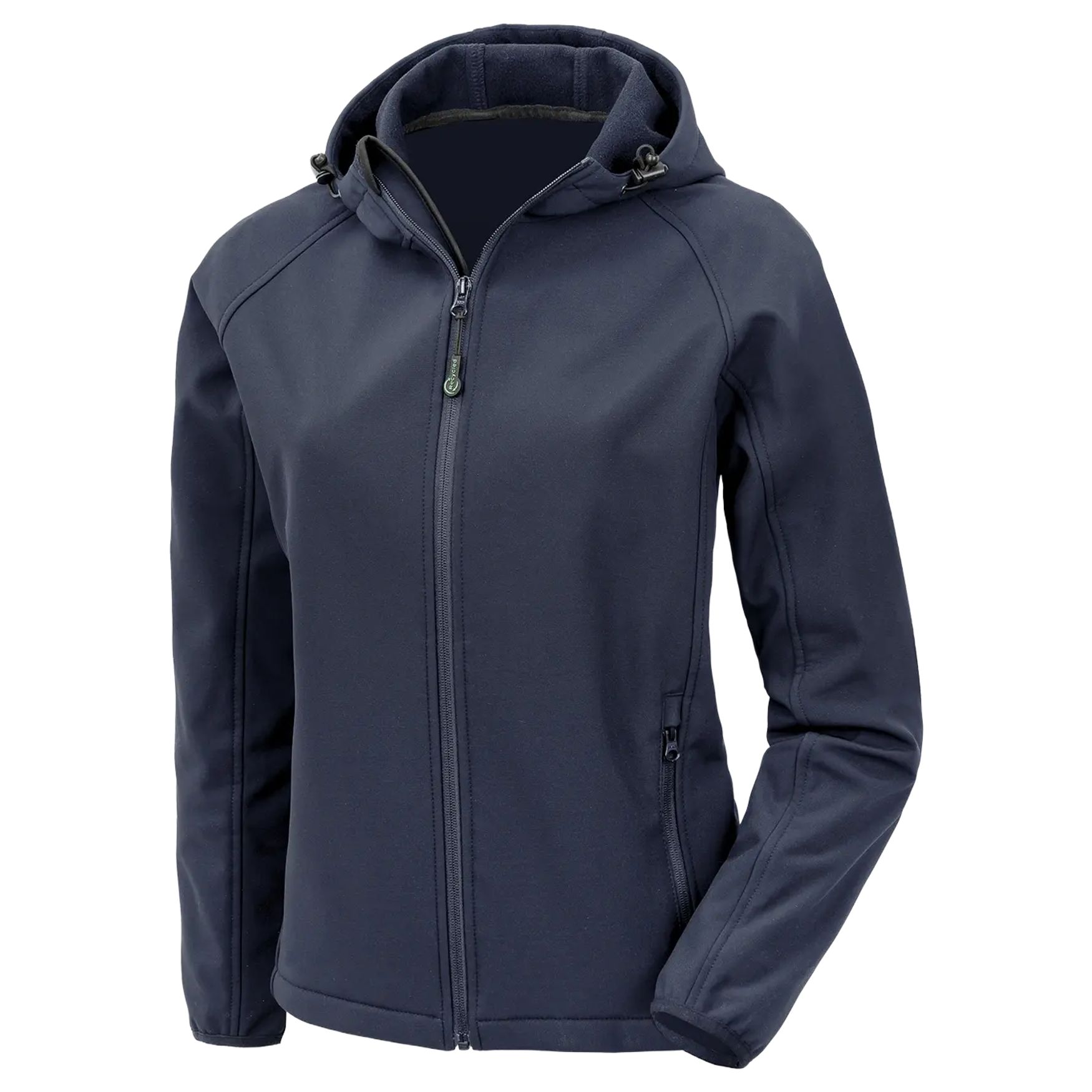 Damen-Softshell 3-Lagen für Outdoor-Aktivitäten bei wechselhaftem Wetter, mit verstellbarer Kapuze, Reißverschlusstaschen und elastischen Bündchen. 3-Lagen-Konstruktion mit Außenseite aus recyceltem Polyester, recycelter TPU-Membran und Mikrofleece-Innenseite.