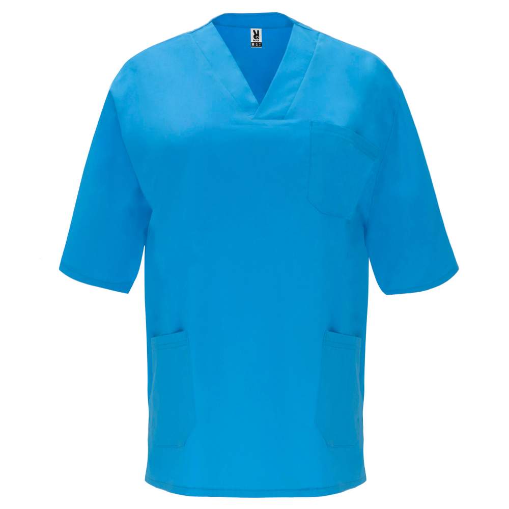 Unisex-Arbeitsbluse mit kurzen Ärmeln. Kreuz-V-Ausschnitt. Eine Brusttasche und zwei Seitentaschen. Seitenöffnungen. Abnehmbares Etikett. Zusammensetzung: 65% Polyester, 35% Baumwollserge