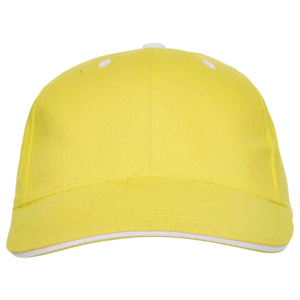 Cap mit 6 Panels. 6 Belüftungslöcher. 6 aufgenähte Linien am Visier. Kontrastierender Rand und Ösen am Visier. Schweißband. Rückverschluss mit Klettband. 100% Baumwolle.