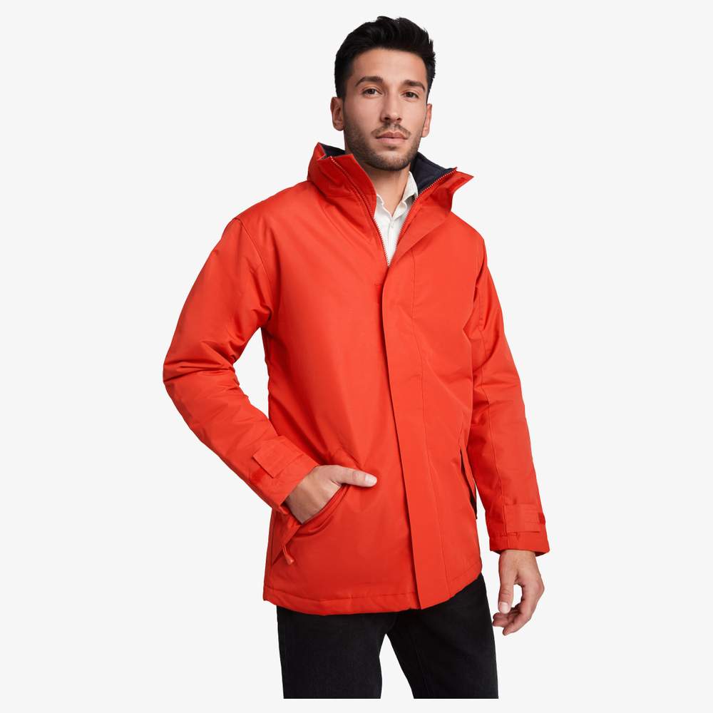 Parka mit hochgestelltem Kragen mit farblich abgestimmtem Reißverschluss. 2 äußere Reißverschlusstaschen mit Schieber und Klappe. 2 innere Taschen mit Klettverschluss. Faltbare Kapuze im Inneren des Kragens dank Klettverschluss. Verstellbare Manschetten mit Klettverschluss. Aufdruck und Bestickung leicht durch den inneren Reißverschluss möglich. Außenmaterial: 100% Polyester wasserdicht. Innenmaterial: 100% Polyester gefüttert. Kragen aus Fleece.