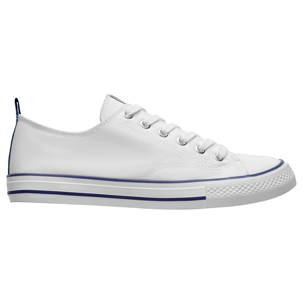 Klassischer Turnschuh aus Leinen mit weißer Gummisohle verziert mit bunten Linien. Seitenlüftung, Gummiende und Schnürverschluss.