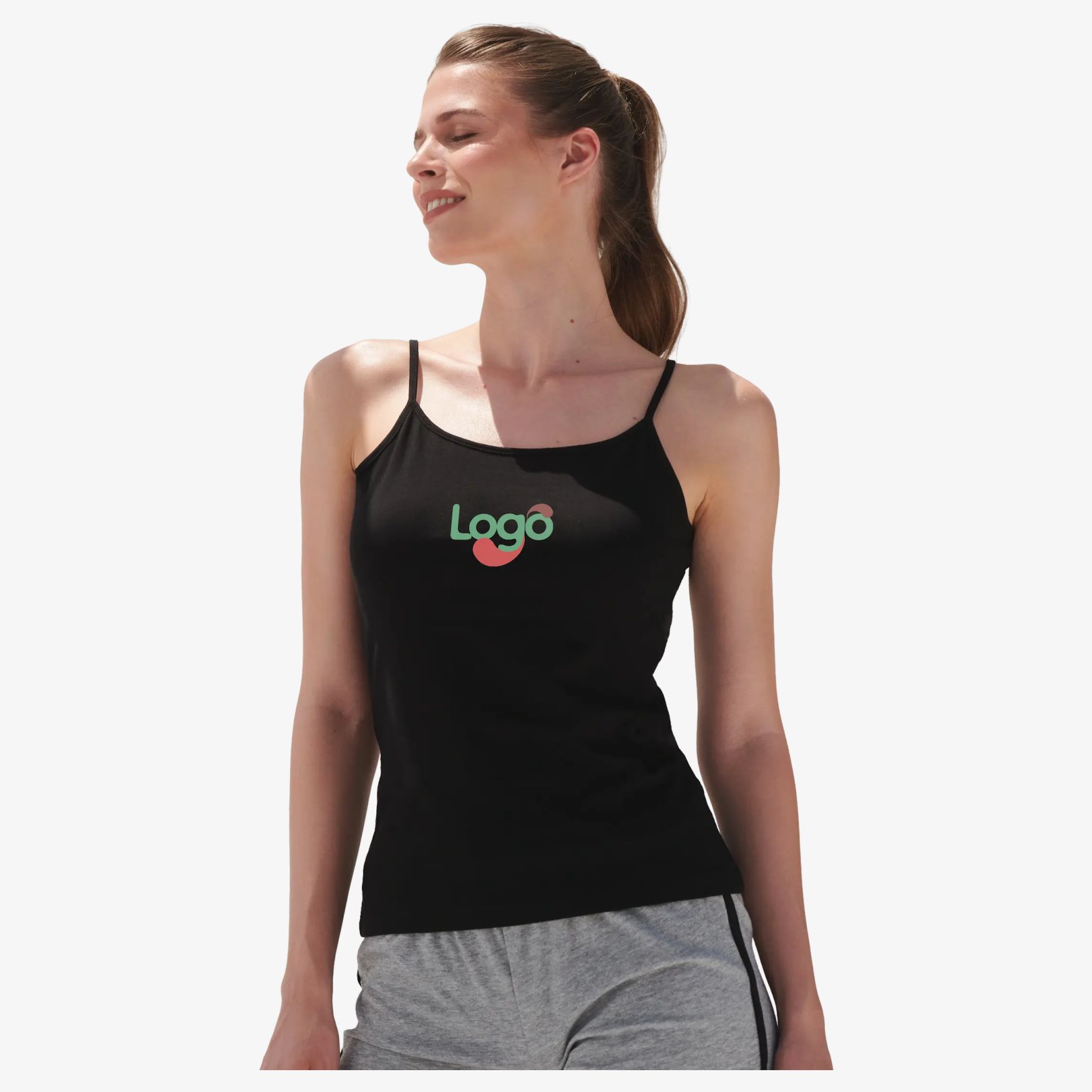 Das Damen-Tanktop mit dünnen Trägern verfügt über verstellbare Träger und ein abnehmbares Etikett. Die Zusammensetzung besteht aus 96% Baumwolle und 4% Elasthan für einen elastischen und bequemen Stoff.