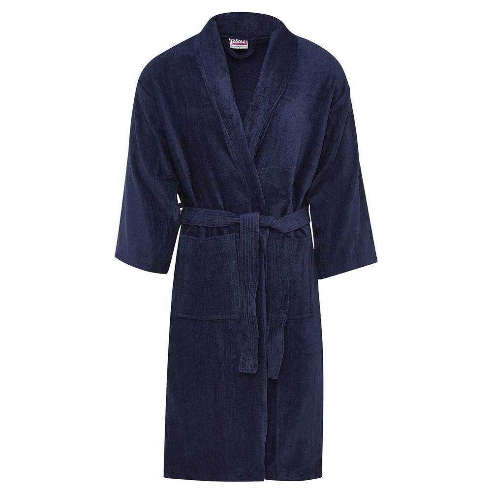 Ein unisex-Bademantel aus Baumwollvelours, der eine weiche Berührung und ein Gefühl von Komfort bietet. Dieses Modell mit seinem Umlegekragen, 3/4 Ärmeln und integriertem Gürtel sorgt für eine bequeme und praktische Passform. Es verfügt auch über zwei seitliche Taschen für mehr Komfort.