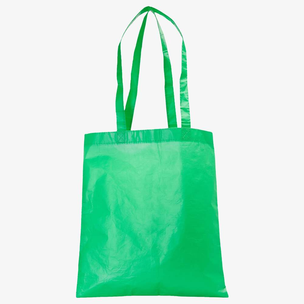 Genähter wiederverwendbarer Beutel mit laminierter matter Oberfläche. Abmessungen: 41 x 37 cm. Griffgröße: 65 x 2,5 cm. Zusammensetzung: Beutel aus RPET.