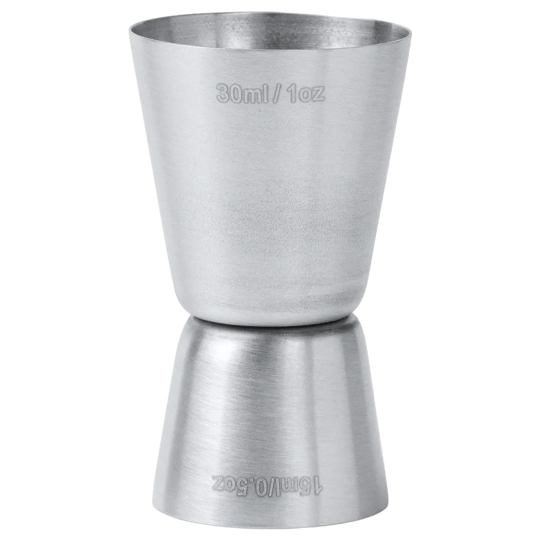 Der Cardu Doppel-Messbecher ck3995 aus Edelstahl, mit zwei Fassungsvermögen von 15 ml und 30 ml zum schnellen Abmessen von zwei Volumina.