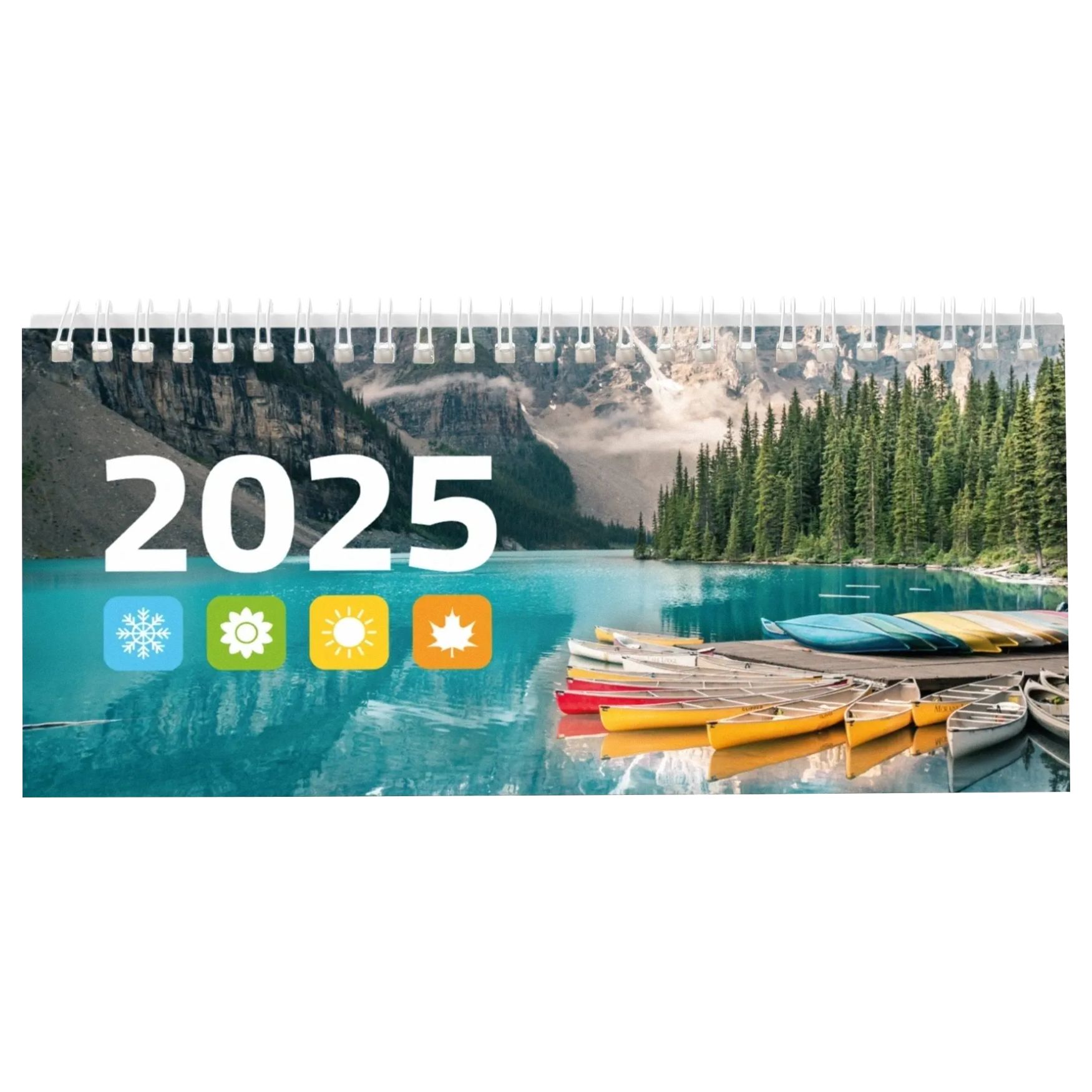 Der Flint horizontale Schreibtisch-Papierkalender mit Ringen dient der monatlichen Übersicht auf einem aufstellbaren Träger. Das Layout umfasst den aktuellen Monat, den vorherigen Monat und den folgenden Monat sowie einen Jahreskalender und die Angabe der Namenstage. Nutzung auf Spanisch und Englisch.