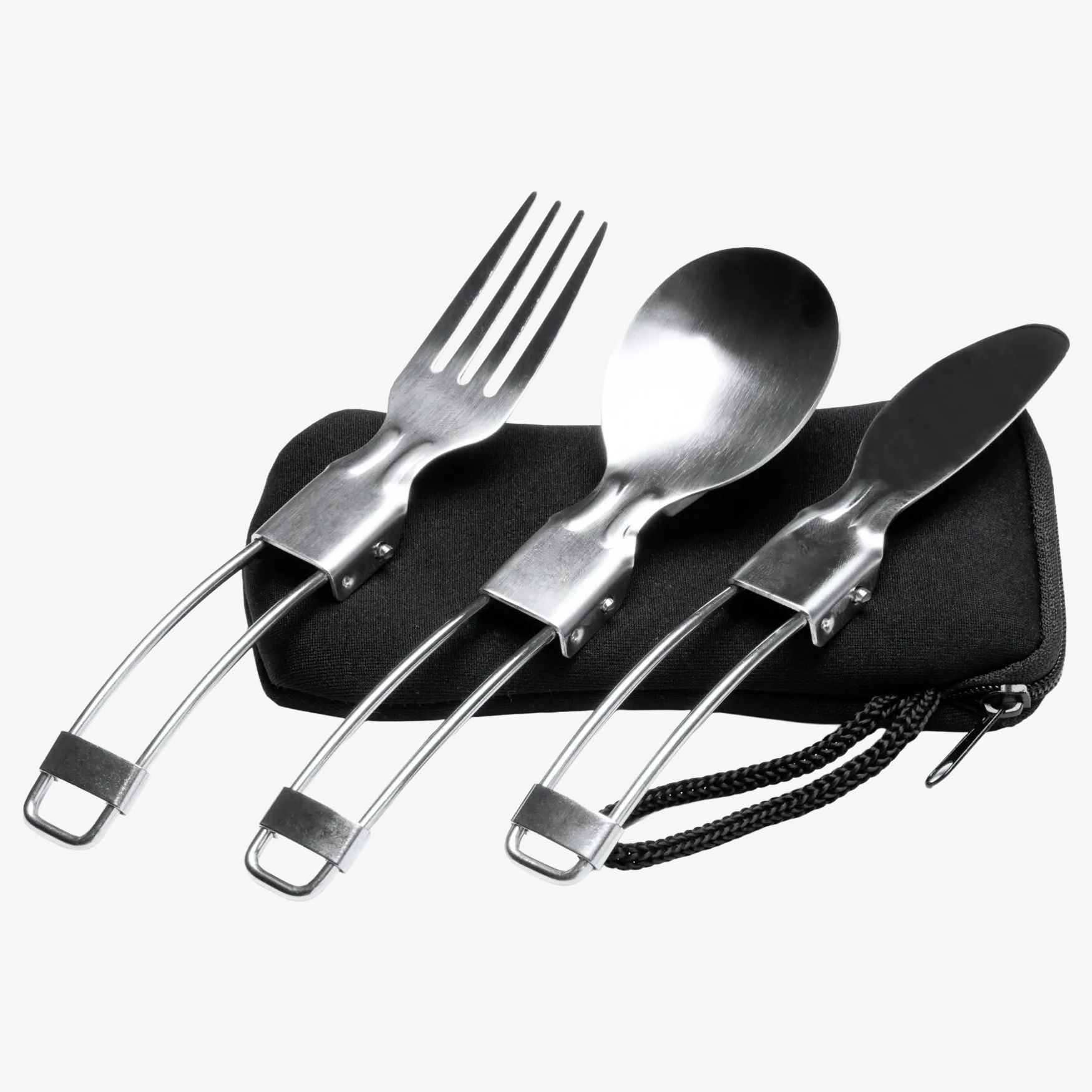 Das Tinker Klappbesteck-Set aus Edelstahl mit Neoprenetui umfasst eine Gabel, ein Messer und einen Löffel für Mahlzeiten unterwegs. Klappformat für platzsparende Aufbewahrung.