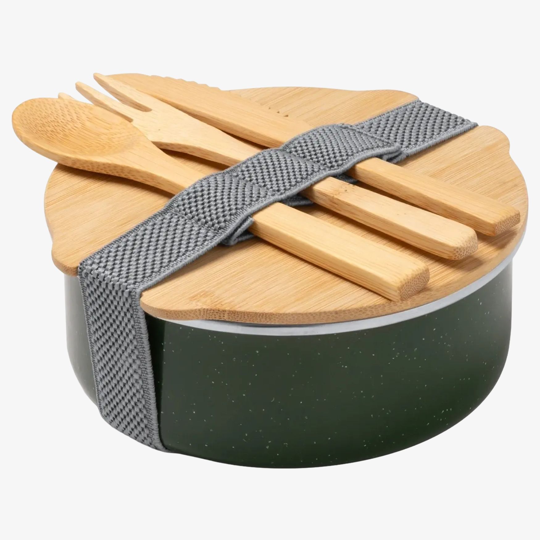 Die Lunchbox Evelin aus Metall mit Keramikbeschichtung und Bambusdeckel ist für den Transport einer Mahlzeit geeignet. Verschluss mit Elastikband. Set aus Bambusbesteck. Fassungsvermögen 750 ml. Maße 15,4 x 6,8 cm.