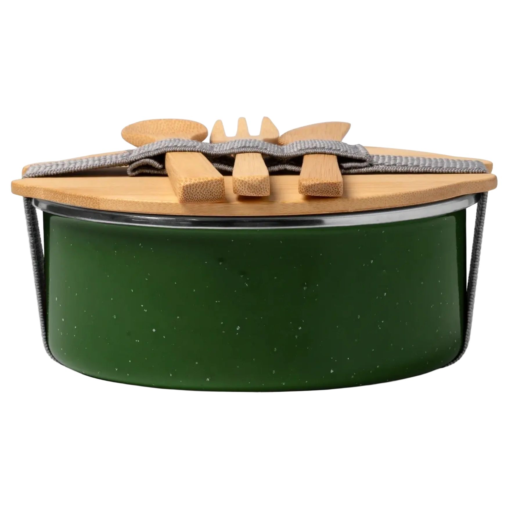 Die Lunchbox Evelin aus Metall mit Keramikbeschichtung und Bambusdeckel ist für den Transport einer Mahlzeit geeignet. Verschluss mit Elastikband. Set aus Bambusbesteck. Fassungsvermögen 750 ml. Maße 15,4 x 6,8 cm.