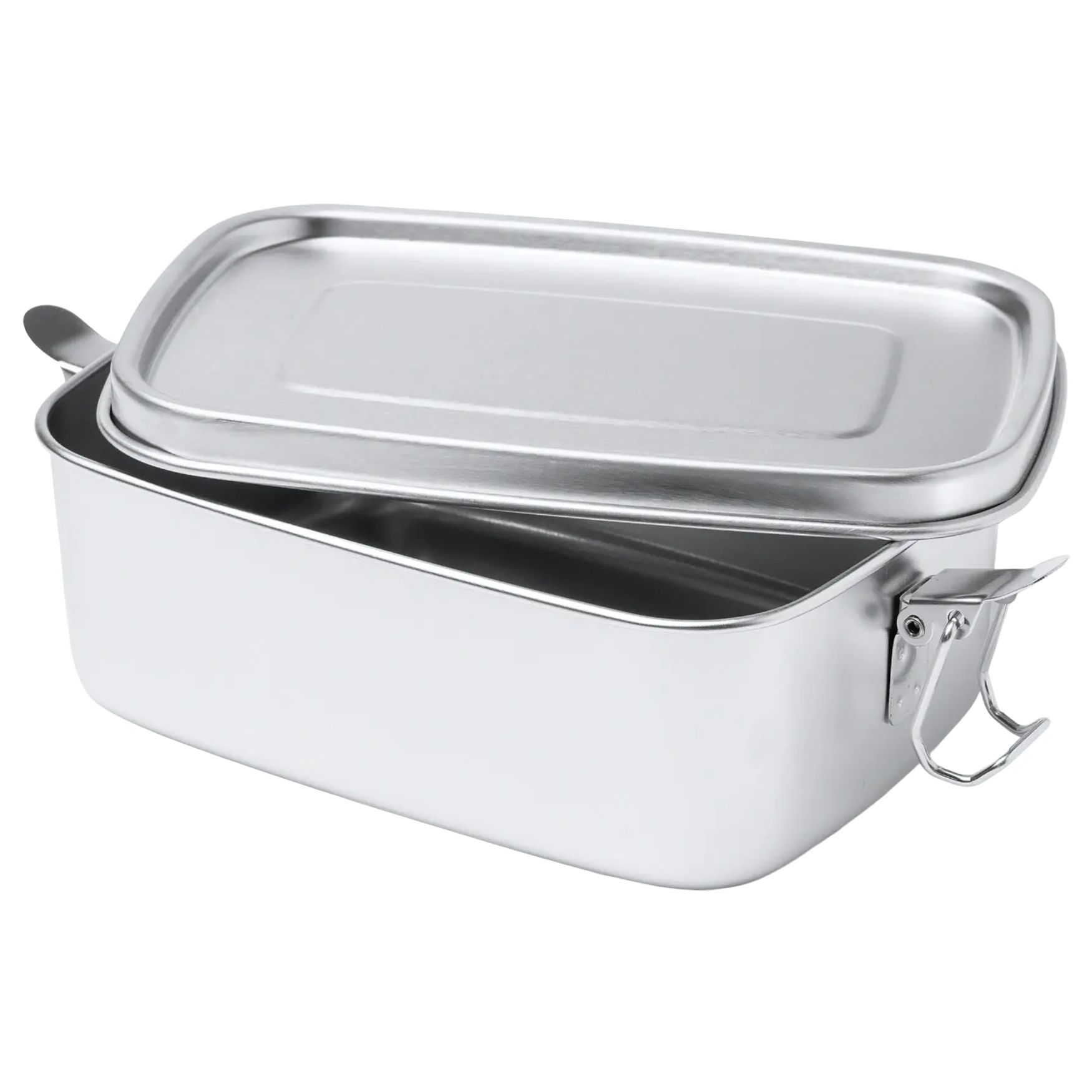 Die Brena Lunchbox aus Edelstahl 304 mit seitlichem Bügelverschluss eignet sich für den Transport von Lebensmitteln. Fassungsvermögen 1,2 Liter und Maße 19,6 x 7 x 13,6 cm.