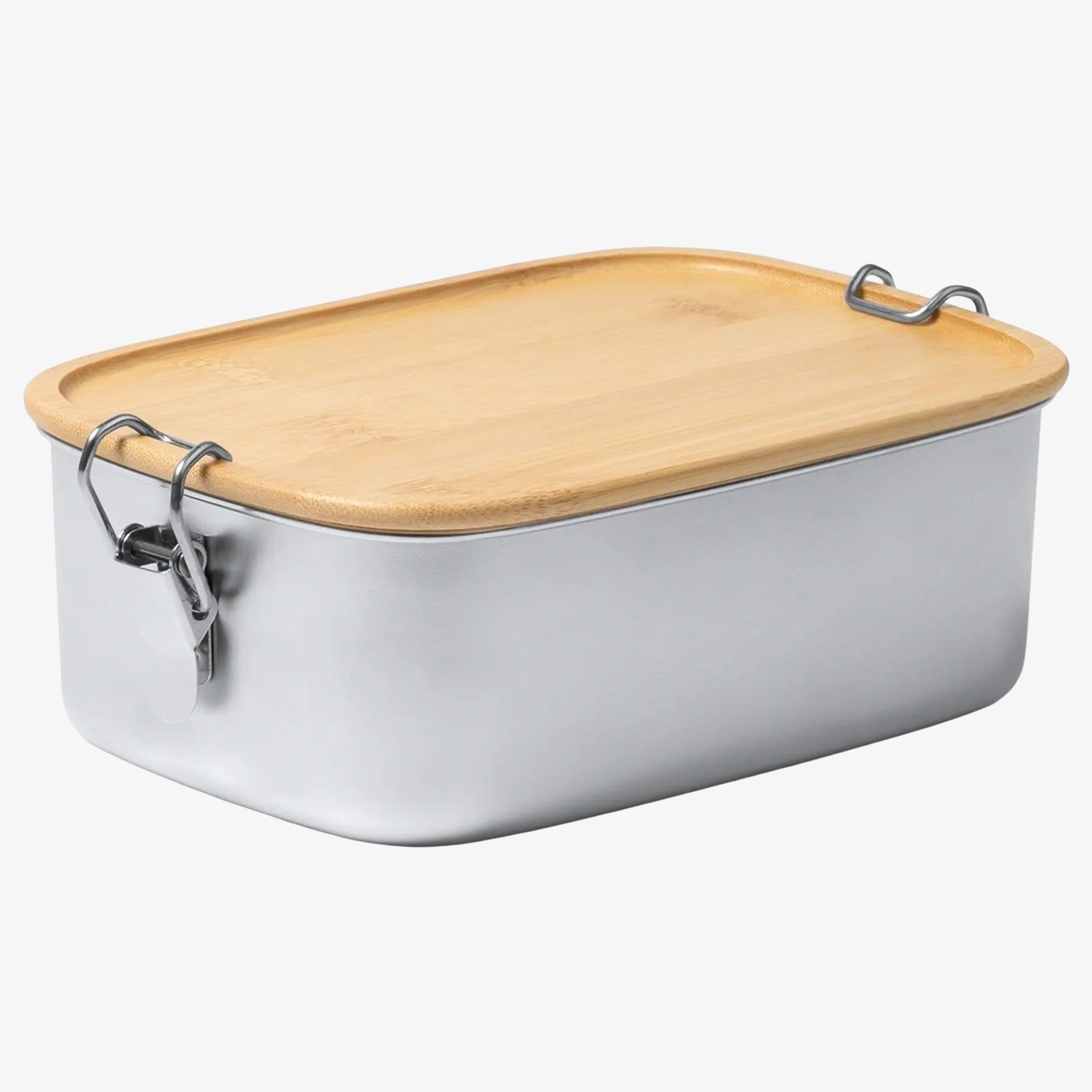 Die Daikon Lunchbox aus Edelstahl 304 mit Bambusdeckel eignet sich für den Transport und die Aufbewahrung von Lebensmitteln. Fassungsvermögen 1 l und seitliche Verschlussbügel für den Verschluss.