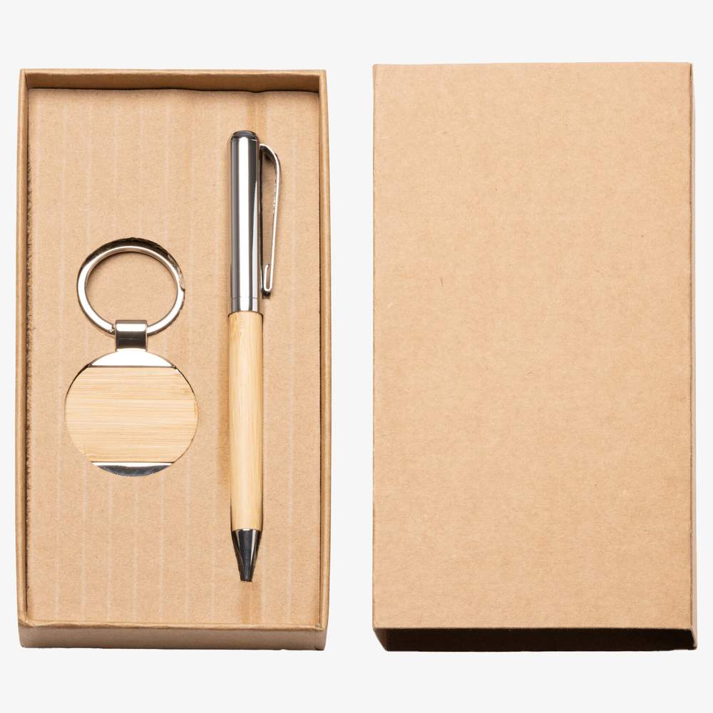 Dieses Set umfasst einen Kugelschreiber und einen Schlüsselanhänger, beide aus Bambus mit metallischen Details gefertigt. Der Stift ist mit blauer Tinte ausgestattet. Das Set wird in einem ökodesigneten Etui präsentiert, das für eine praktische Aufbewahrung und den Transport konzipiert ist. Die verwendeten Materialien wurden für ihre Haltbarkeit und Umweltfreundlichkeit ausgewählt. Dieses Set ist für den täglichen Gebrauch geeignet, sei es im Büro, in der Schule oder unterwegs.