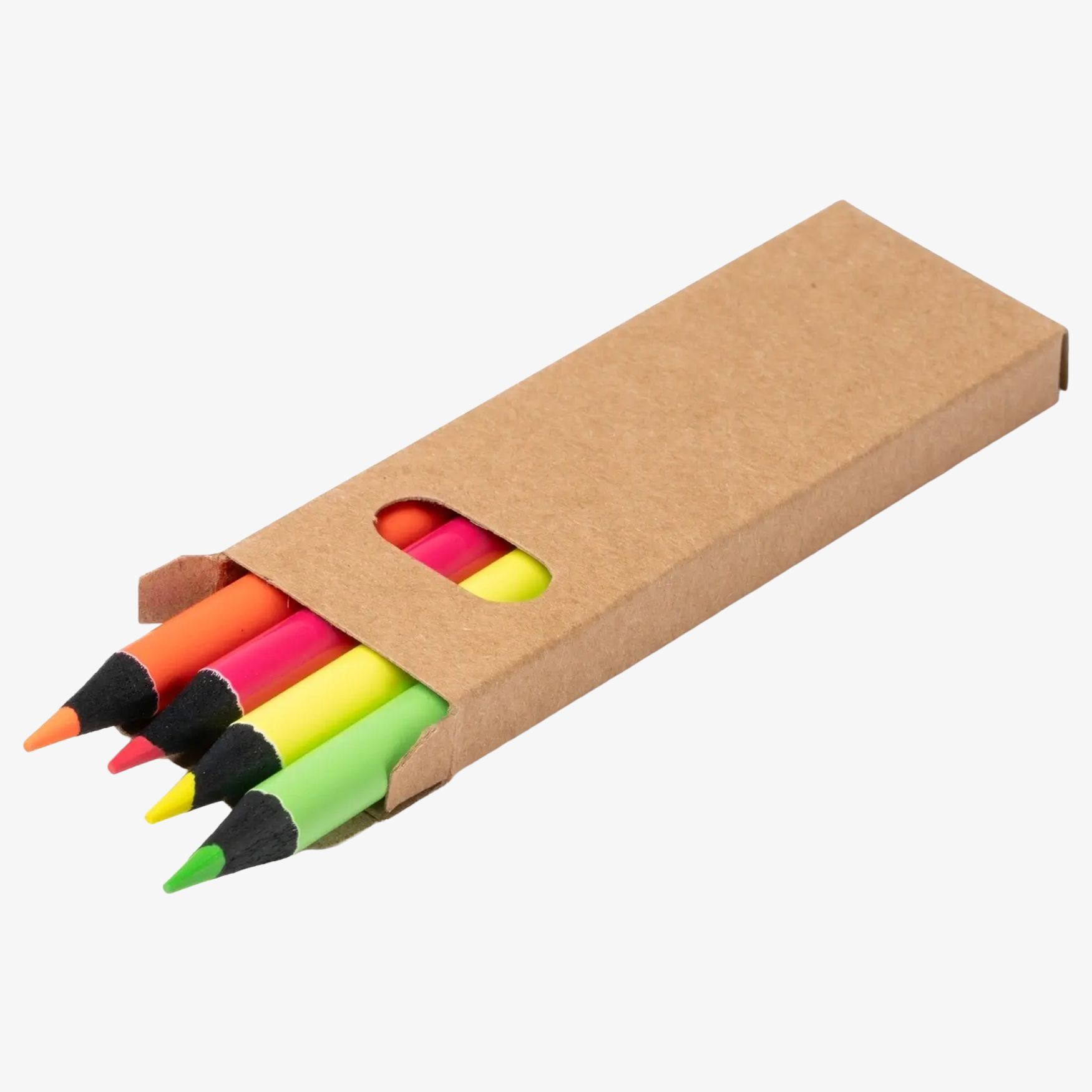 Das Set enthält 4 fluoreszierende Farbstifte aus schwarzem Holz, präsentiert in einer Kraftpapierbox. Diese Stifte eignen sich für verschiedene Anwendungen dank ihres kompakten Formats.