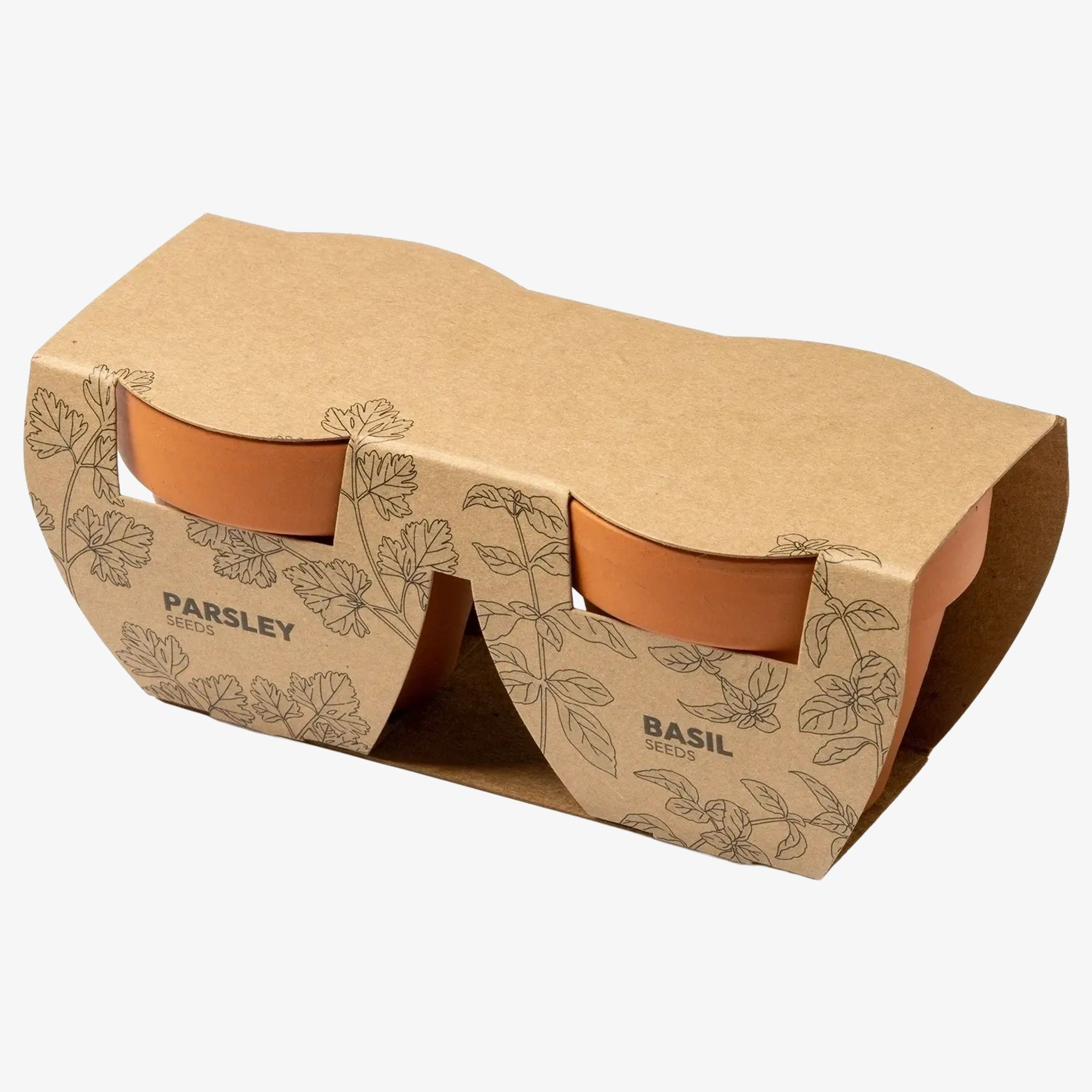 Das Set enthält zwei Blumentöpfe mit Basilikum- und Petersiliensamen sowie ein Substrat für den Anbau. Hergestellt in der Europäischen Union.