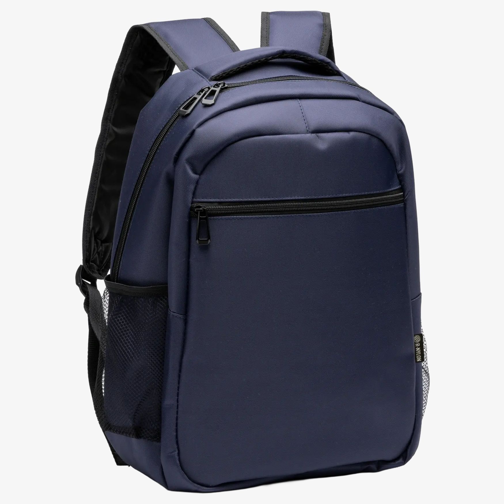 Der Rucksack aus recyceltem Nylon verfügt über ein geräumiges Hauptfach mit einem gepolsterten Fach für einen 15'' Laptop. Er hat außerdem eine Außentasche sowie zwei Seitentaschen. Die Schultergurte und der Rücken sind gepolstert für besseren Tragekomfort. Ein Trolley-Gurt ist integriert für einfacheren Transport.