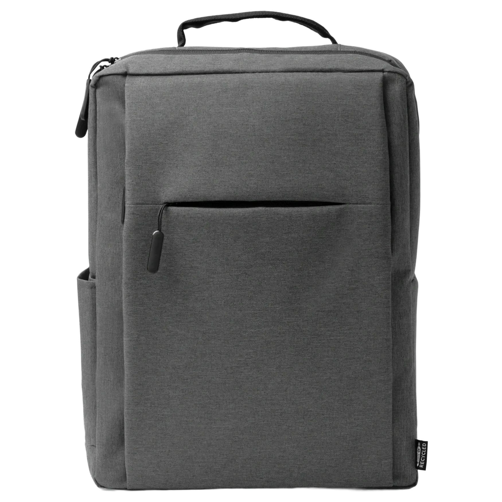Der BRUSON Rucksack besteht aus RPET mit melierter Oberfläche. Er verfügt über ein großes Innenfach mit Laptopfach für 15\"-Geräte und eine äußere Reißverschlusstasche. Eine Seitentasche, gepolsterte Griffe und eine Trageschlaufe ergänzen die Ausstattung.