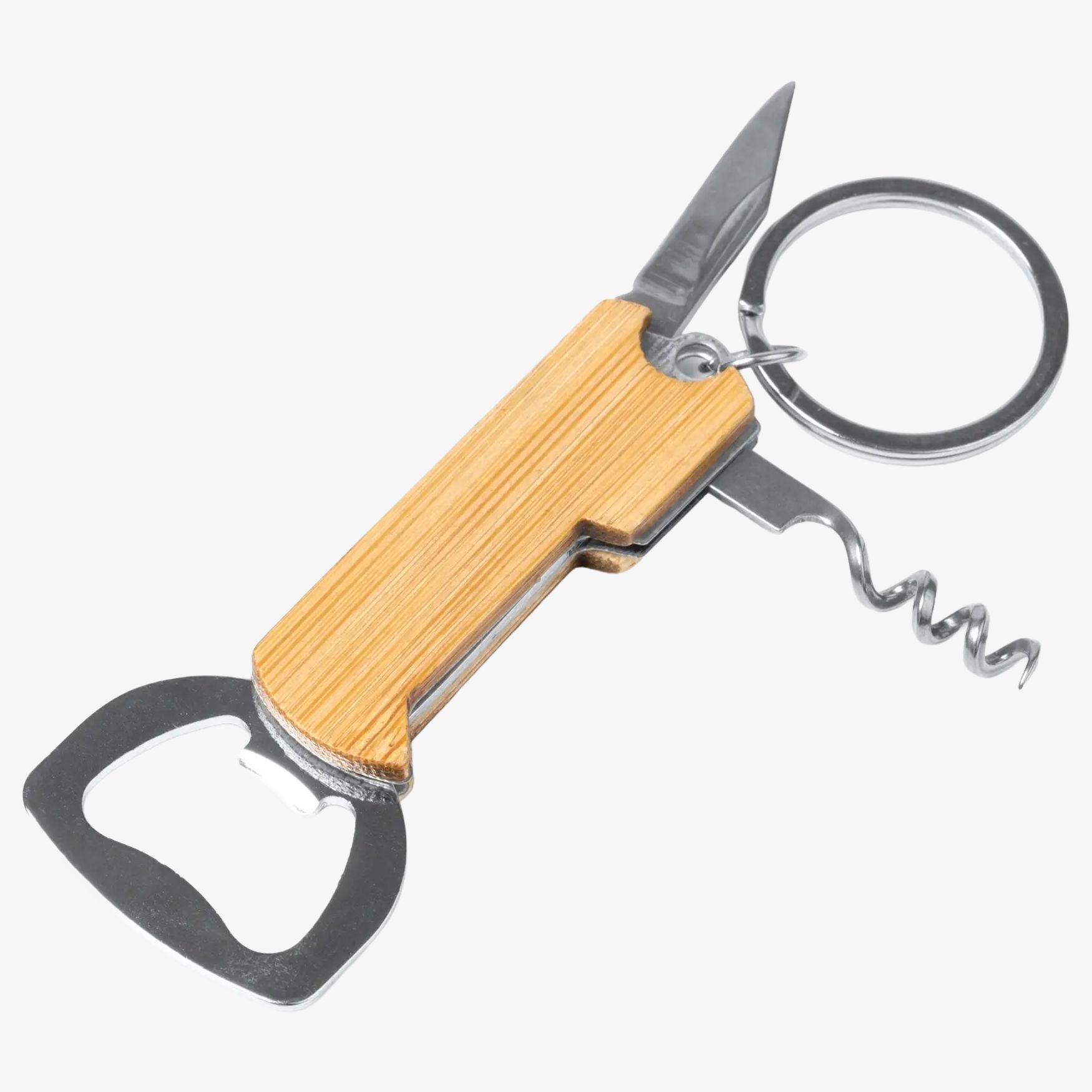 Der Gunes Flaschenöffner-Schlüsselanhänger na1558 mit Messer, Korkenzieher und Bambuskorpus. Kompaktes Format, geeignet zum Mitführen am Schlüsselbund für den täglichen Gebrauch.