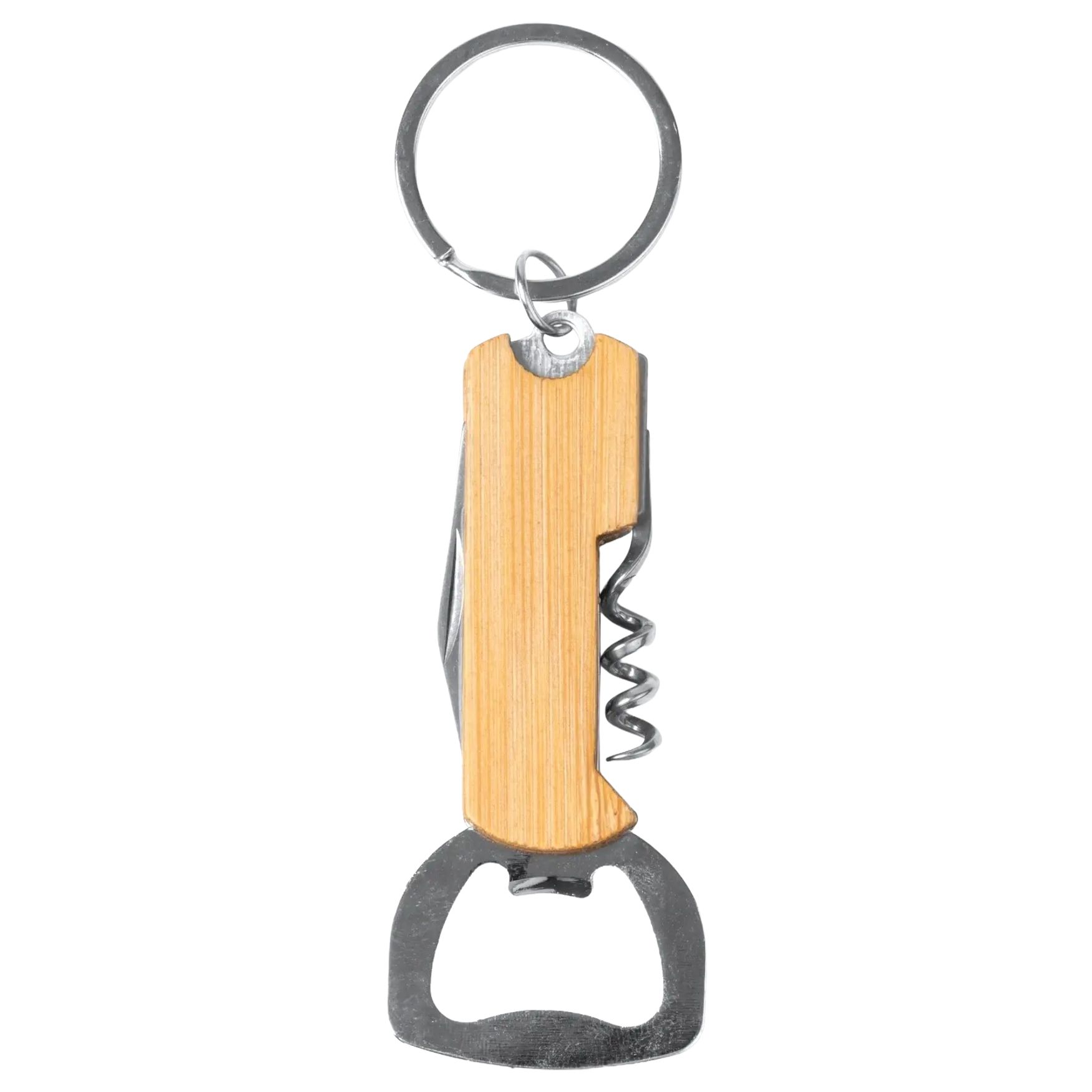 Der Gunes Flaschenöffner-Schlüsselanhänger na1558 mit Messer, Korkenzieher und Bambuskorpus. Kompaktes Format, geeignet zum Mitführen am Schlüsselbund für den täglichen Gebrauch.
