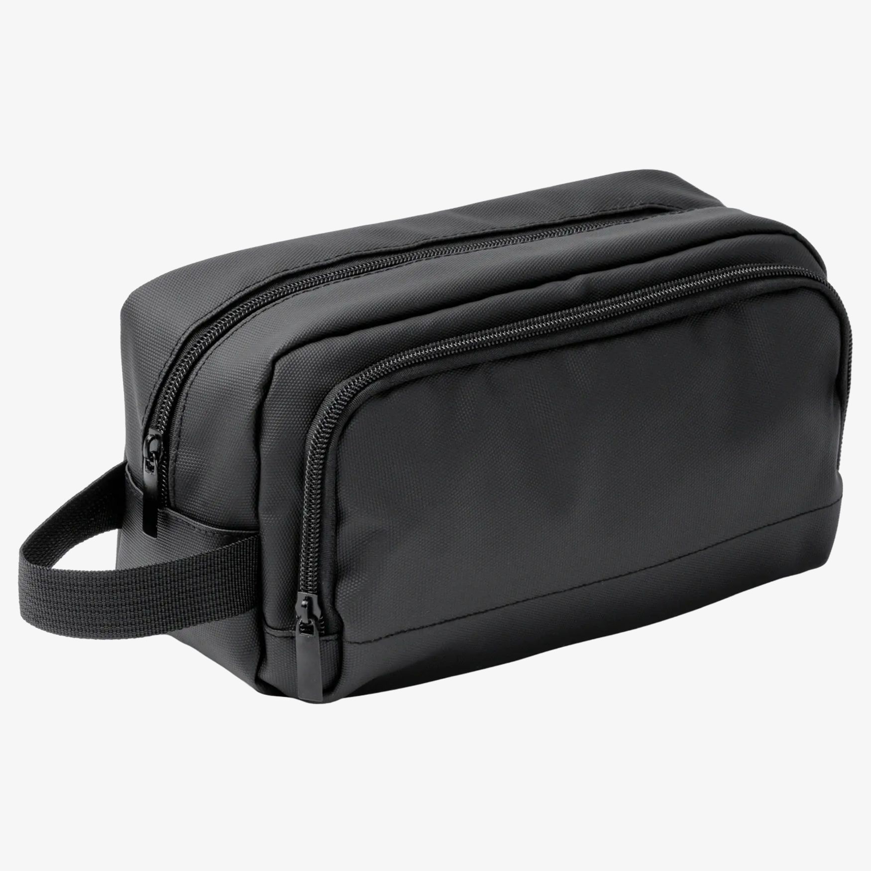 Das Lederetui LOMIX hat ein doppeltes Fach mit Reißverschluss und einen Tragegriff. Es ermöglicht das sichere und elegante Verstauen von Hygieneartikeln. Maße: 24 x 13 x 11 cm.
