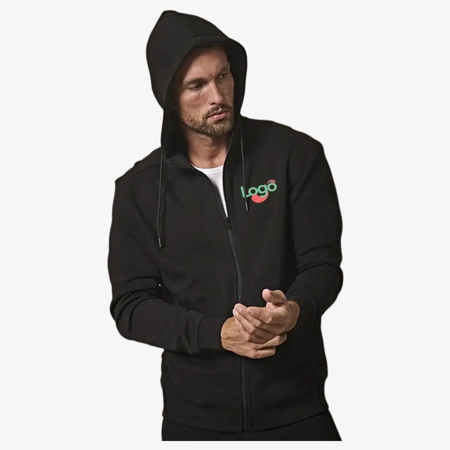 Das Hooded Full Zip ist eine Sweatjacke mit Kapuze und Reißverschluss, geeignet für den täglichen Gebrauch. Der durchgehende Reißverschluss erleichtert das Anziehen, während die gefütterte Kapuze mit Kordeln und die zwei offenen Taschen auf der Vorderseite einen praktischen Nutzen hinzufügen. Das Rippbündchen mit Elasthan trägt zum guten Sitz bei. Die Personalisierung ist je nach Träger möglich.