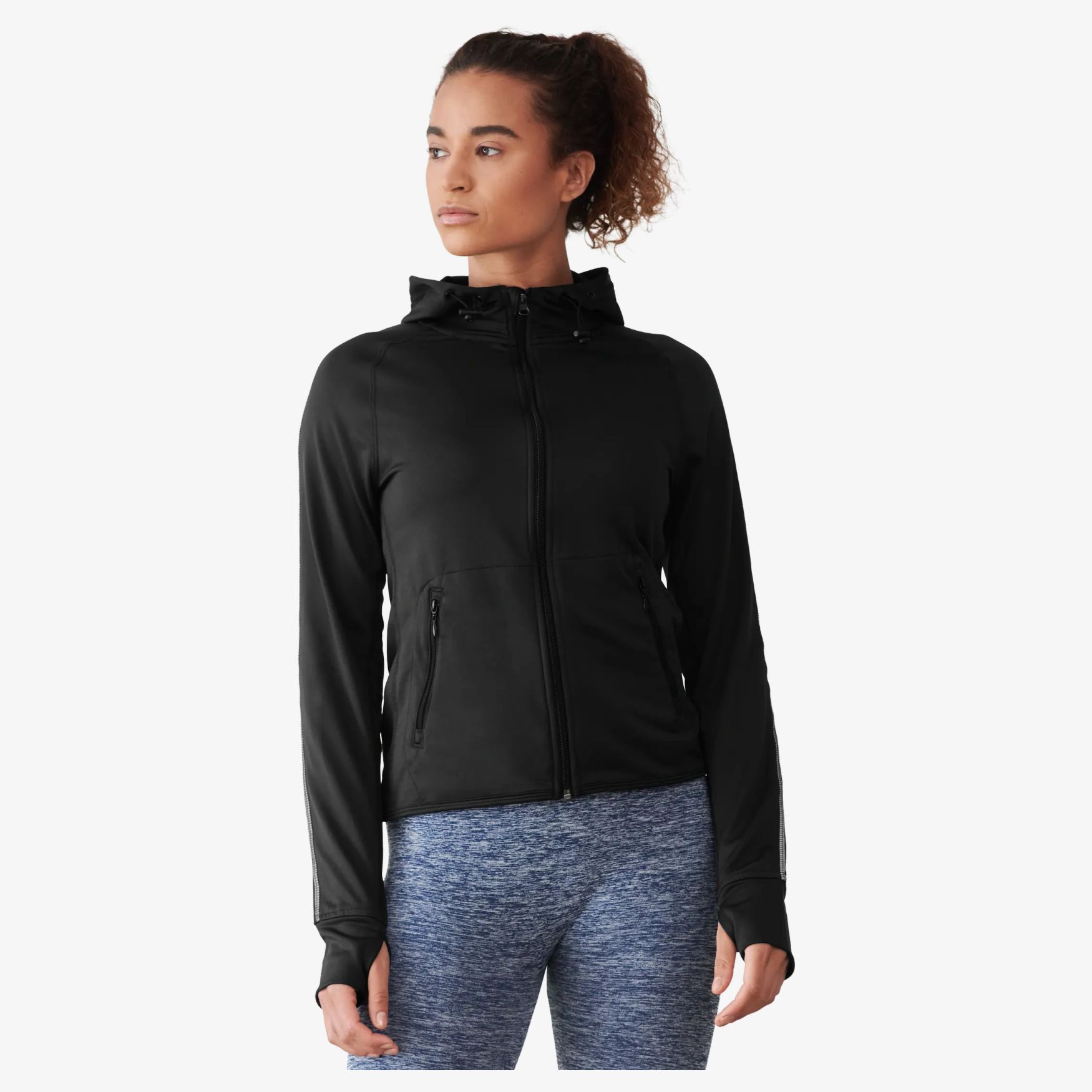 Das Ladies Running Hoodie ist ein Damen Kapuzen-Sweatshirt für sportliche Aktivitäten, mit körpernaher Passform, Raglanärmeln und angerauter Innenseite. Reflektierende Streifen, Daumenloch-Bündchen und seitliche Reißverschlusstaschen zur Aufbewahrung kleiner persönlicher Gegenstände.