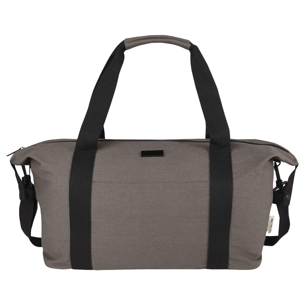 Diese 25-Liter-Sporttasche ist aus robusten Materialien gefertigt, darunter recycelter Stoff und RPET-Futter. Sie bietet ein geräumiges Hauptfach mit Reißverschluss, ergänzt durch eine Innenfach mit Reißverschluss, um Ihre Wertsachen zu sichern. Eine offene Vorder- und eine Rückentasche mit Reißverschluss, die für einen Einkaufswagen konzipiert ist, erhöhen die Funktionalität. Die Tasche kann bequem mit verstärkten Gurtengriffen oder einem abnehmbaren und verstellbaren Schultergurt transportiert werden. Ihre Abmessungen betragen 60 x 22 x 29 cm und ihre Zusammensetzung besteht aus 80% recyceltem Baumwolle und 20% Baumwolle. Es ist möglich, diese Tasche mit Ihrem Logo oder Ihrem Motiv für eine effektive Kommunikation zu personalisieren.