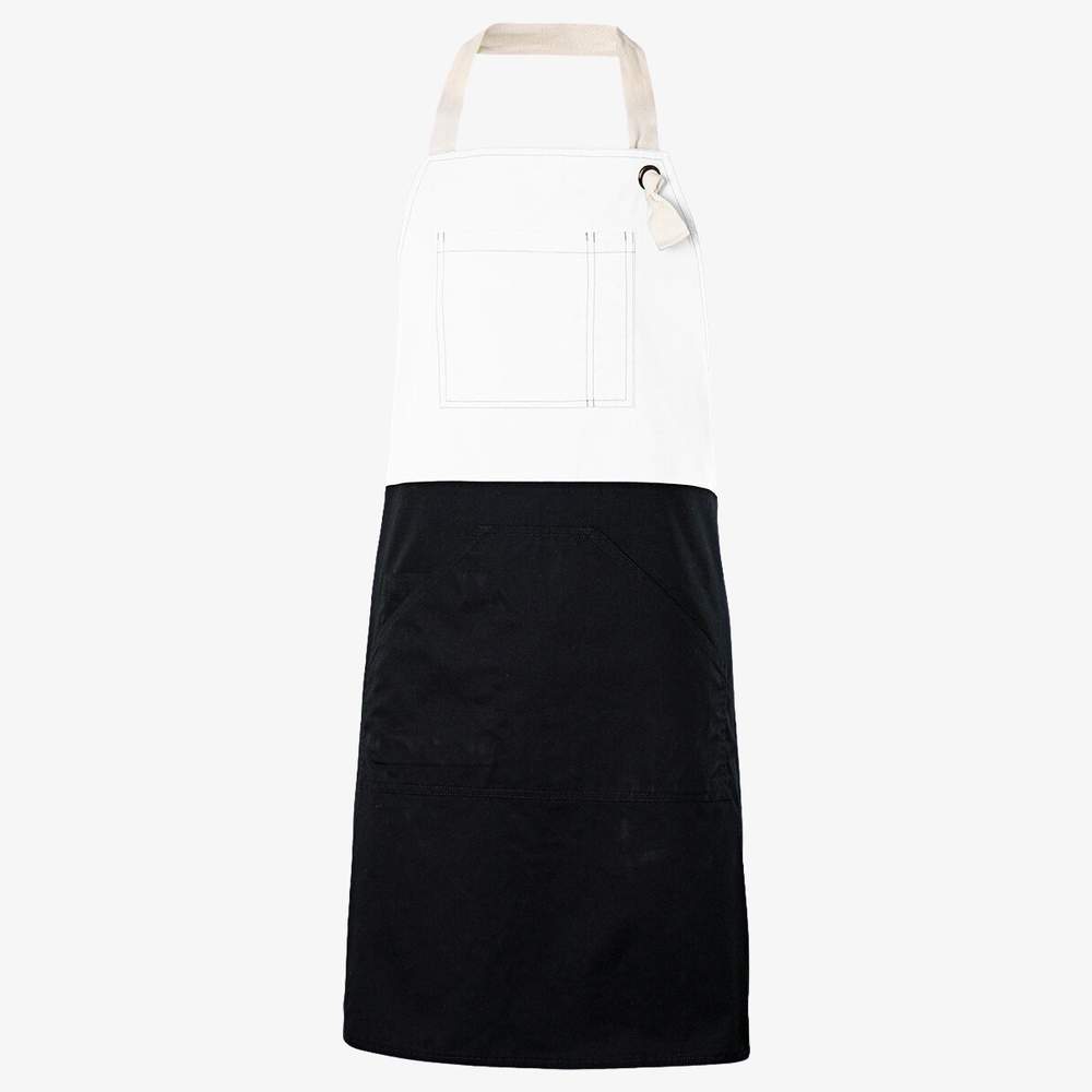 Kochschürze, die Schutz und Komfort bei verschiedenen Aktivitäten bietet. Sie ist mit 2 beige Bändern ausgestattet, die eine individuelle Anpassung ermöglichen. Der Kragen ist verstellbar für einen bequemen Tragkomfort. Diese Kochschürze verfügt über 3 Taschen, die praktischen Stauraum für Werkzeuge und Zubehör bieten. Der untere Teil der Kochschürze ist schwarz, wodurch ein visueller Kontrast entsteht. Die Abmessungen betragen 81x75cm.