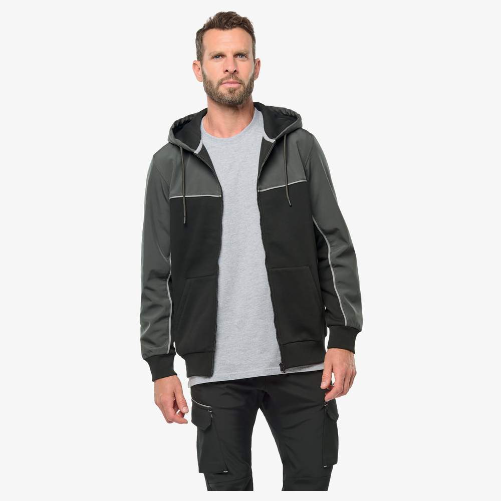 Zweifarbige, umweltfreundliche Zippjacke mit Kapuze für Damen und Herren. Gerader Schnitt für optimalen Tragekomfort. Zwei praktische Kängurutaschen für Stauraum. Die Kapuze mit runder Zugschnur und Gummienden bietet zusätzlichen Schutz. Kontrastierende Einsätze auf der Vorderseite, dem Rücken und den oberen Ärmeln verleihen einen visuellen Akzent. Ein ton-in-ton-Reißverschluss ermöglicht ein einfaches Schließen. Ein halbrunder Rücken aus Softshell verstärkt die Haltbarkeit. Ein kontrastierender Silber-Paspel auf den Einsätzen und Ärmeln verleiht einen stilvollen Akzent. Ein Befestigungsband und ein Silber-V-Saumband im Kragen erleichtern die Nutzung. Die Bündchen und Saumkanten aus 2x2-Rib-Streifen sorgen für einen bequemen Sitz. Das abnehmbare Markenetikett ermöglicht eine einfache Personalisierung.