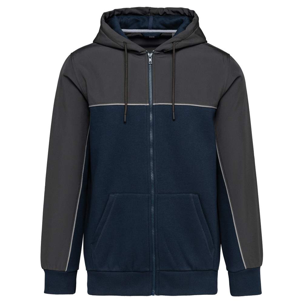 Zweifarbige, umweltfreundliche Zippjacke mit Kapuze für Damen und Herren. Gerader Schnitt für optimalen Tragekomfort. Zwei praktische Kängurutaschen für Stauraum. Die Kapuze mit runder Zugschnur und Gummienden bietet zusätzlichen Schutz. Kontrastierende Einsätze auf der Vorderseite, dem Rücken und den oberen Ärmeln verleihen einen visuellen Akzent. Ein ton-in-ton-Reißverschluss ermöglicht ein einfaches Schließen. Ein halbrunder Rücken aus Softshell verstärkt die Haltbarkeit. Ein kontrastierender Silber-Paspel auf den Einsätzen und Ärmeln verleiht einen stilvollen Akzent. Ein Befestigungsband und ein Silber-V-Saumband im Kragen erleichtern die Nutzung. Die Bündchen und Saumkanten aus 2x2-Rib-Streifen sorgen für einen bequemen Sitz. Das abnehmbare Markenetikett ermöglicht eine einfache Personalisierung.