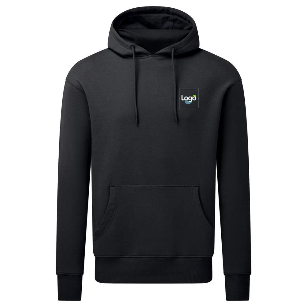 Soft to the touch sweatshirt. Doubled hood. Interior in brushed fleece. Eyelets and drawstring end stops of matching color and nickel-free. Double stitching. Ribbed cuffs cut and sewn 1x1. Kangaroo pocket. Size label inside the collar of matching color. Composition: solid colors 80% organic cotton, 20% recycled polyester; heather grey 73% organic cotton, 21% recycled polyester, 6% viscose. This hooded sweatshirt is customizable by embroidery, allowing you to add your logo, your visual or any other graphic element for effective and original communication.