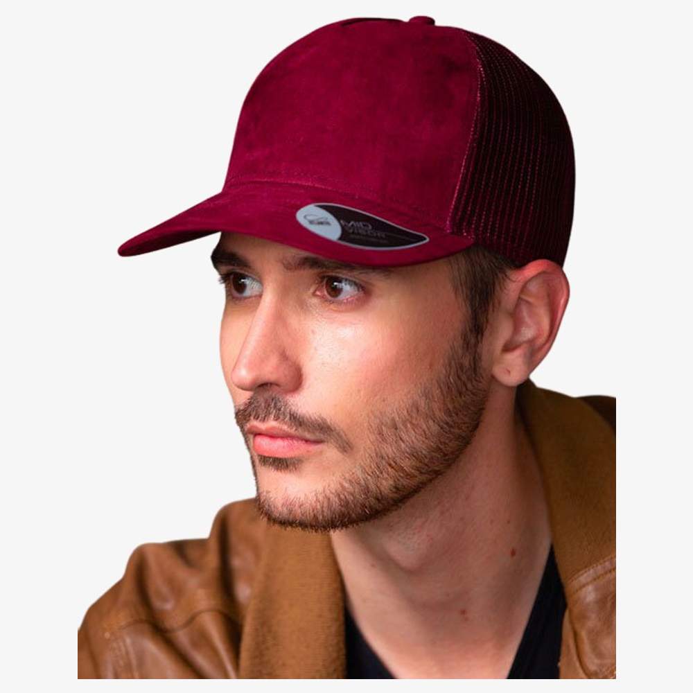 5-panel cap made of polyester and featuring a pre-curved visor. It includes a 100% cotton chino headband for added comfort. Its construction includes 8 seams on the visor. The front panel and visor are made of 100% polyester, while the side and back panels are made of 100% polyester mesh
