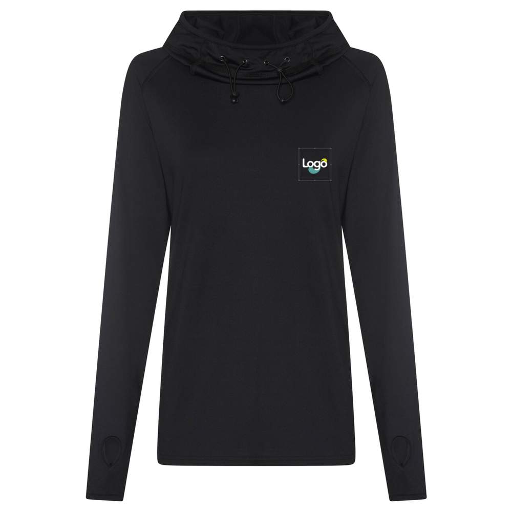 This hooded top is designed with a flattering fit for the female silhouette and a hood that forms a cowl neck. It is perfect as an extra layer before, during or after a workout. AWDis CoolFit blended fabric contains elastane for elasticity, ensuring comfort and good hold. Sporty cut with raglan sleeves for great freedom of movement. Reflective elements on the hood for increased visibility in low light situations. Reflective tab on the nape to keep the headphone cord in place. Adjustable hood and flat stitch details for optimal comfort. Thumb hole. A simple peel-off label facilitates brand change. This top is customizable with embroidery to display your logo or your design.