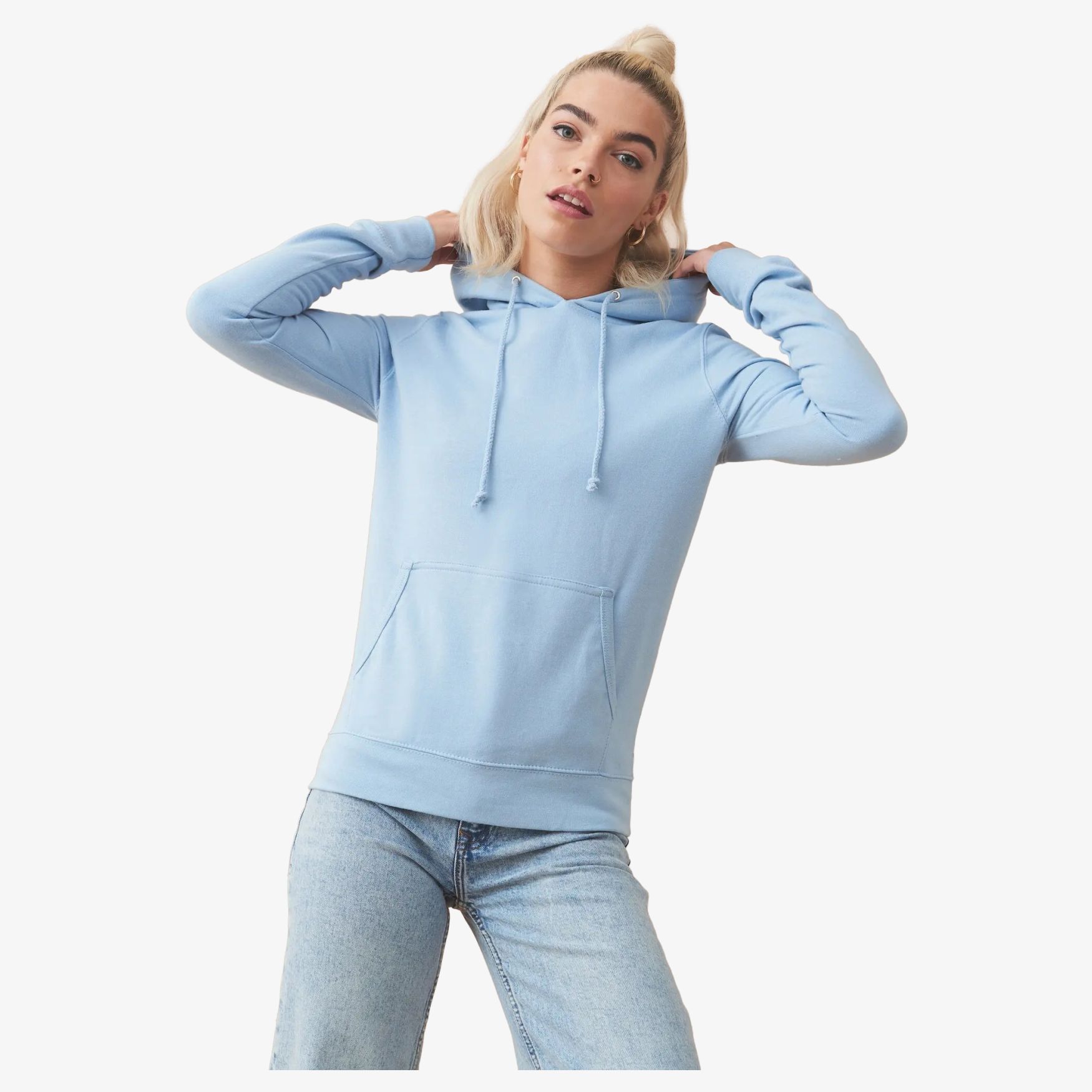 This woman's hooded sweatshirt is designed with a feminine cut and soft cotton fabric. It is perfect for a casual and comfortable look. Double-stitched finishes ensure increased durability. The lined hood and matching drawstrings add a touch of style. The ribbed pocket edge offers additional comfort. The detachable label allows for easy customization.
