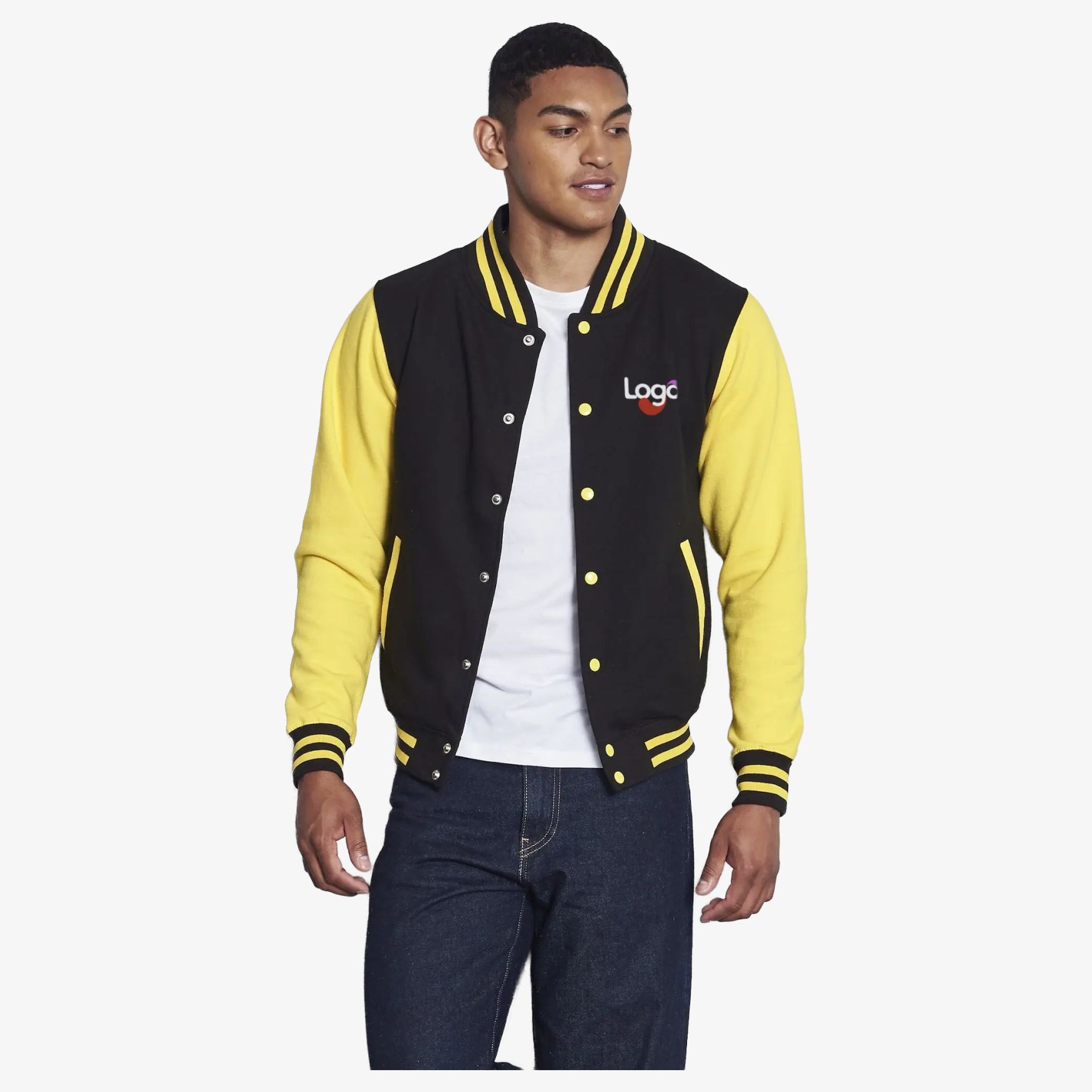 Adopt the university style with this classic jacket inspired by American fashion. Contrasting sleeves and press studs complete the look of this jacket made from a thick fabric. Ribbed collar, cuffs, and waistband with decorative stripes. Contrasting pockets. Neck tape. Suspension loop at the back of the neck. Removable label. Customization possible with embroidery or your logo.