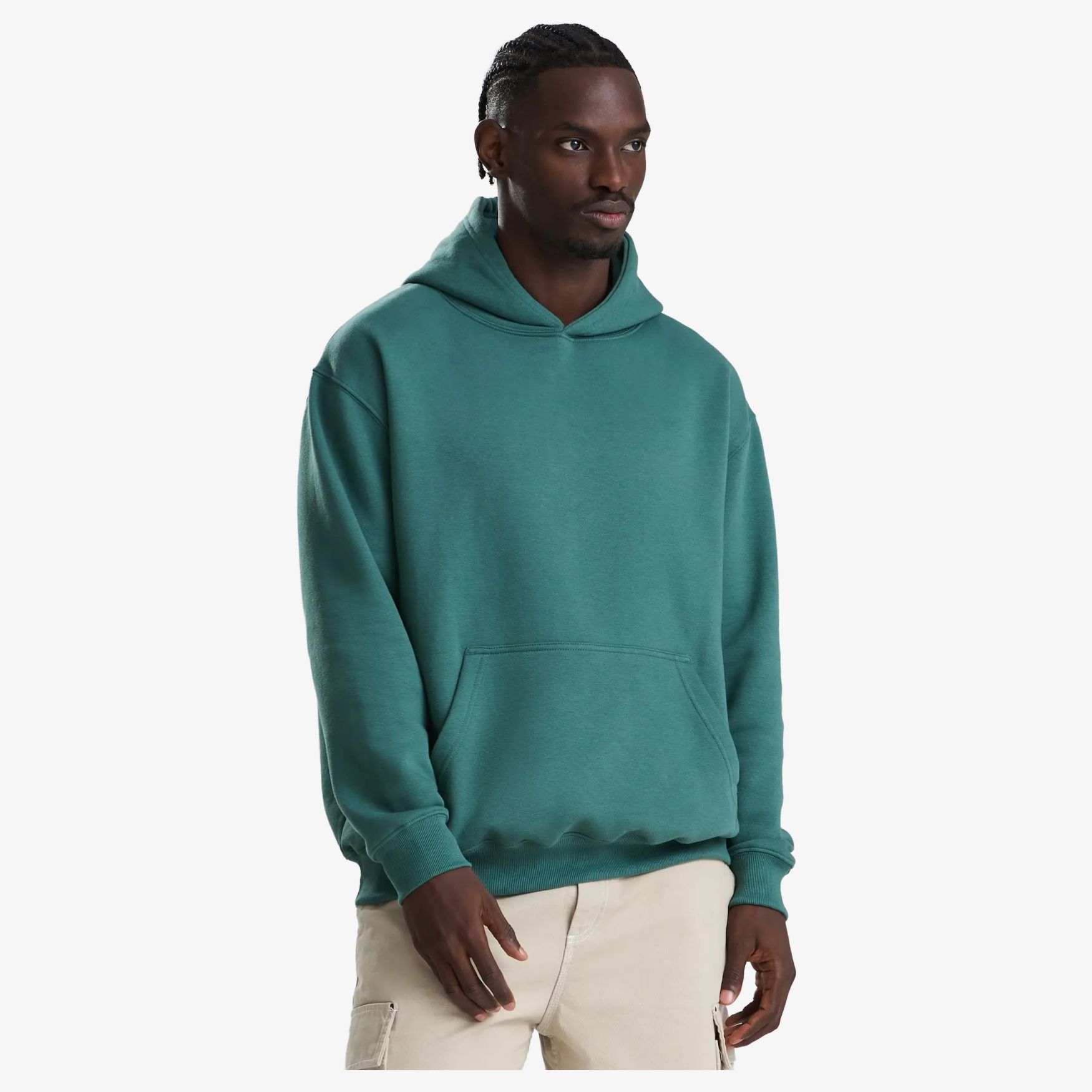 The Vision Heivyweight Hoddie is a heavyweight hooded sweatshirt in three-layer fleece, designed with an oversized fit and a kangaroo pocket. The three-panel hood is made from the main fabric and has no drawcords. The cuffs and hem are in rib knit, with a size label only.