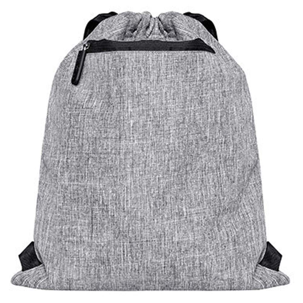 Gray heathered 600D polyester sports bag. It features a main compartment secured by tightening the side straps and a front zippered compartment. The zipper is black with a rubber slider bearing the "Bags2Go" relief. The bag's volume is approximately 3 liters. This bag is designed to carry personal items during sports or leisure activities.